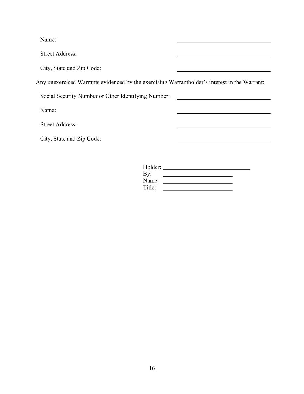 16 Name: Street Address: City, State and Zip Code: Any unexercised Warrants evidenced by the exercising Warrantholder’s interest in the Warrant: Social Security Number or Other Identifying Number: Name: Street Address: City, State and Zip Code: Holder: By: Name: Title:
