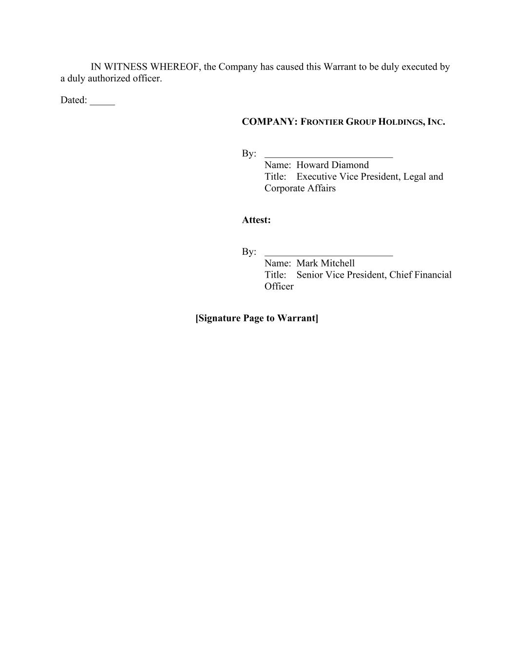 IN WITNESS WHEREOF, the Company has caused this Warrant to be duly executed by a duly authorized officer. Dated: _____ COMPANY: FRONTIER GROUP HOLDINGS, INC. By: Name: Howard Diamond Title: Executive Vice President, Legal and Corporate Affairs Attest: By: Name: Mark Mitchell Title: Senior Vice President, Chief Financial Officer [Signature Page to Warrant]