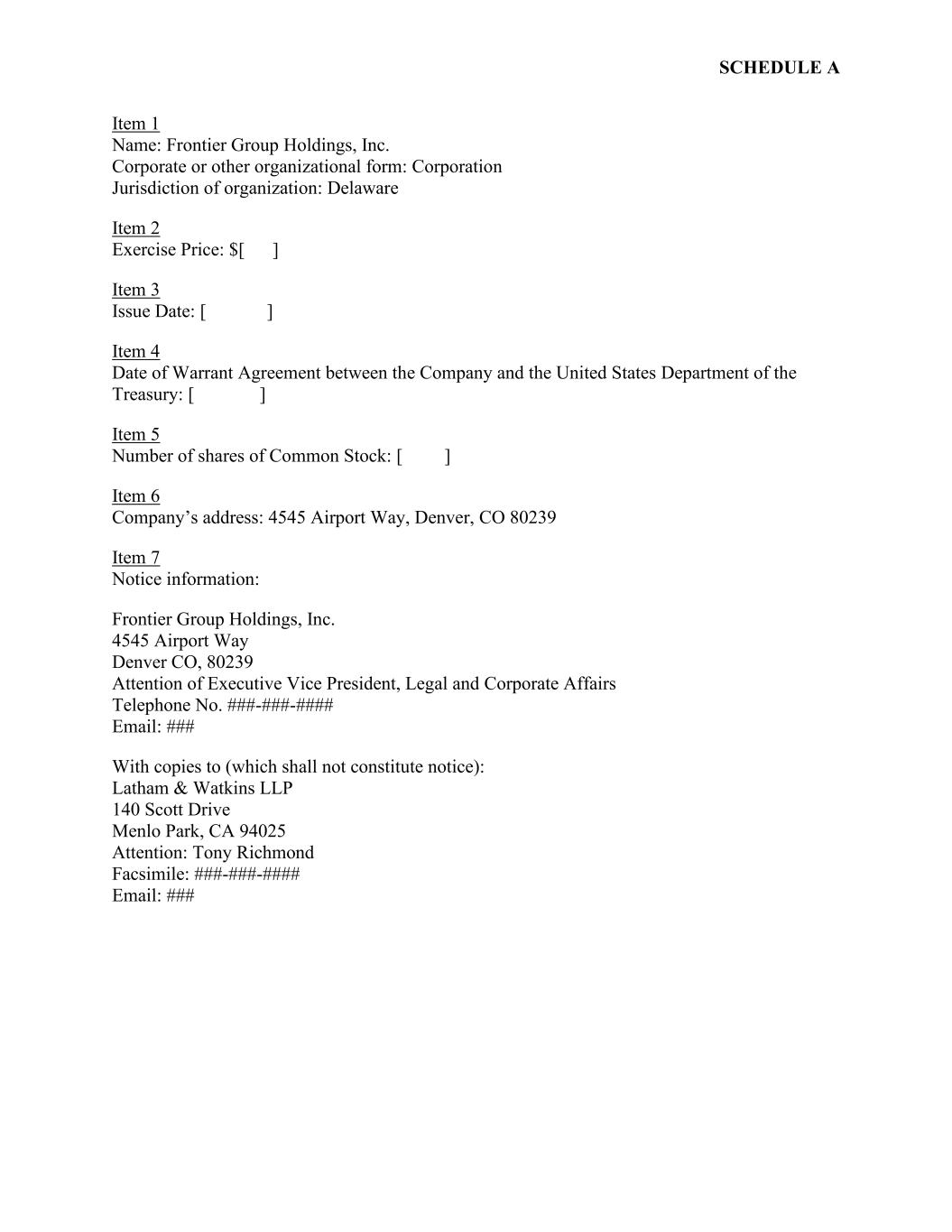 SCHEDULE A Item 1 Name: Frontier Group Holdings, Inc. Corporate or other organizational form: Corporation Jurisdiction of organization: Delaware Item 2 Exercise Price: $[ ] Item 3 Issue Date: [ ] Item 4 Date of Warrant Agreement between the Company and the United States Department of the Treasury: [ ] Item 5 Number of shares of Common Stock: [ ] Item 6 Company’s address: 4545 Airport Way, Denver, CO 80239 Item 7 Notice information: Frontier Group Holdings, Inc. 4545 Airport Way Denver CO, 80239 Attention of Executive Vice President, Legal and Corporate Affairs Telephone No. ###-###-#### Email: ### With copies to (which shall not constitute notice): Latham & Watkins LLP 140 Scott Drive Menlo Park, CA 94025 Attention: Tony Richmond Facsimile: ###-###-#### Email: ###