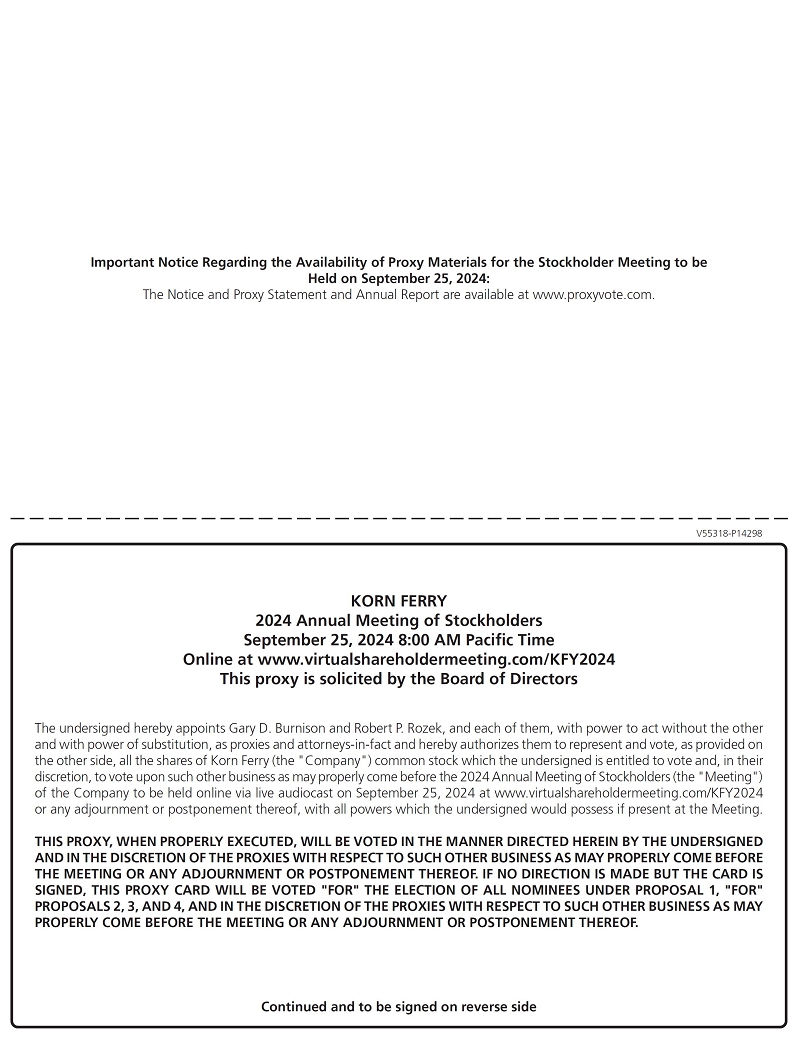 On behalf of the Board of Directors (the “Board”), senior management and more than 9,000 employees of Korn Ferry (the “Company,” “firm,” “we,” “its,” and “our”), it is my pleasure to invite you to our 2024 Annual Meeting of Stockholders on September 25, 2024, at 8:00 a.m. Pacific Time (the “Annual Meeting”).