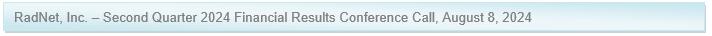 LOS ANGELES, California, August 7, 2024 – RadNet, Inc. (NASDAQ: RDNT), a national leader in providing high-quality, cost-effective, fixed-site outpatient diagnostic imaging services through a network of 398 owned and operated outpatient imaging centers, today reported financial results for its second quarter of 2024.