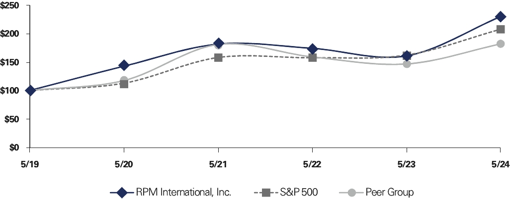 | | RPM International’s fundamental objective is to build long-term stockholder value by profitably growing our businesses and consistently delivering strong financial performance. We think that our ability to generate value for our stockholders is inextricably linked to our ability to provide value to our principal stakeholders, including our customers and associates. • We must continue to earn the ongoing commitment and trust of our stockholders by delivering the solid returns expected by them from an investment in RPM. • We must continue to offer our customers innovative, high-quality products and services at competitive prices. • We must attract and retain high-quality associates at every level of our organization, provide them with the tools they need to do their jobs, and compensate them in such a way as to closely align their interests with our long-term success. • We must conduct our business in conformity with The Values & Expectations of 168, which encompass complying with all legal and ethical standards, and working to be exemplary corporate citizens. We do not focus narrowly on efforts to maximize the short-term price of our stock, and think that such an approach is fundamentally misguided. Instead, we believe that emphasizing consistent value creation in our businesses will maximize the long-term value of our stockholders’ investment. In short, we manage our businesses to create wealth for our stockholders. Creating value for our stakeholders is how we have achieved, and will continue to achieve, that objective. | |