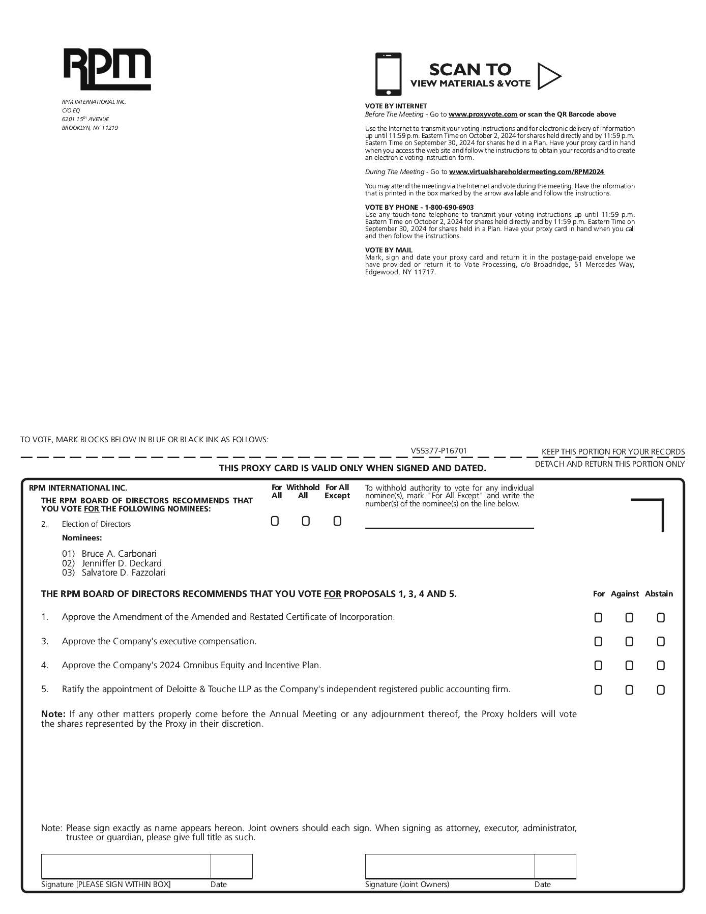 ![]() | RECORD DATE Shareholders of record on the close of business on August 9, 2024 are entitled to vote at the 2024 Annual Meeting. | | | ![]() | BY INTERNET Using your computer visit proxyvote.com until 11:59 PM, Eastern Daylight Time, on October 2, 2024 for shares held directly or 11:59 PM, Eastern Daylight Time, on September 30, 2024 for shares held in a Plan or vote online on October 3, 2024 during the Annual Meeting at: www.virtualshareholdermeeting.com/RPM2024 | |