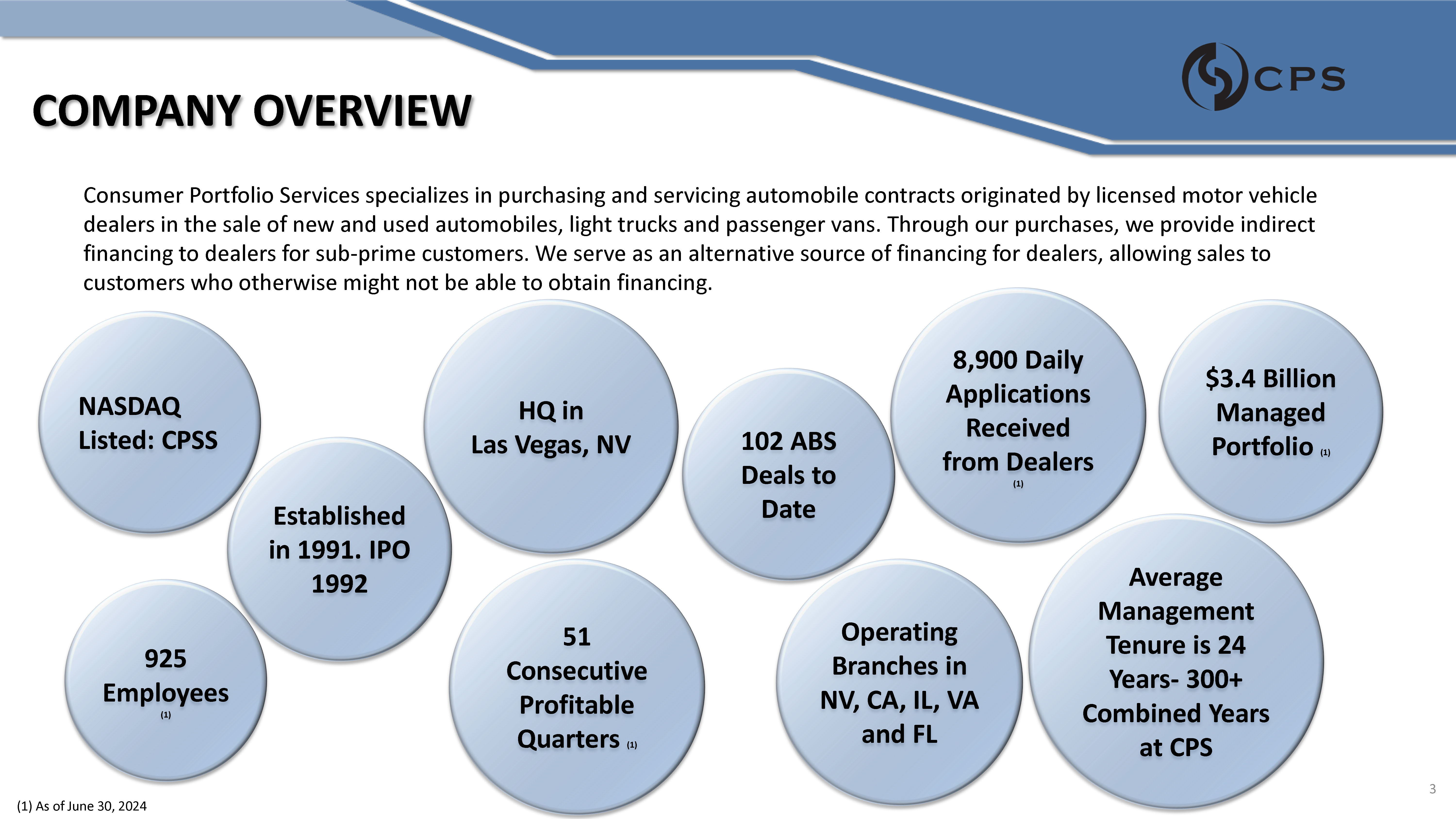 COMPANY OVERVIEW Consumer Portfolio Services specializes in purchasing and servicing automobile contracts originated by licensed motor vehicle dealers in the sale of new and used automobiles, light trucks and passenger vans. Through our purchases, we provide indirect financing to dealers for sub - prime customers. We serve as an alternative source of financing for dealers, allowing sales to customers who otherwise might not be able to obtain financing. $3.4 Billion Managed Portfolio (1) NASDAQ Listed: CPSS Average Management Tenure is 24 Years - 300+ Combined Years at CPS HQ in Las Vegas, NV Operating Branches in NV, CA, IL, VA and FL 925 Employees (1) 8,900 Daily Applications Received from Dealers (1) Established in 1991. IPO 1992 51 Consecutive Profitable Quarters (1) 102 ABS Deals to Date (1) As of June 30, 2024 3