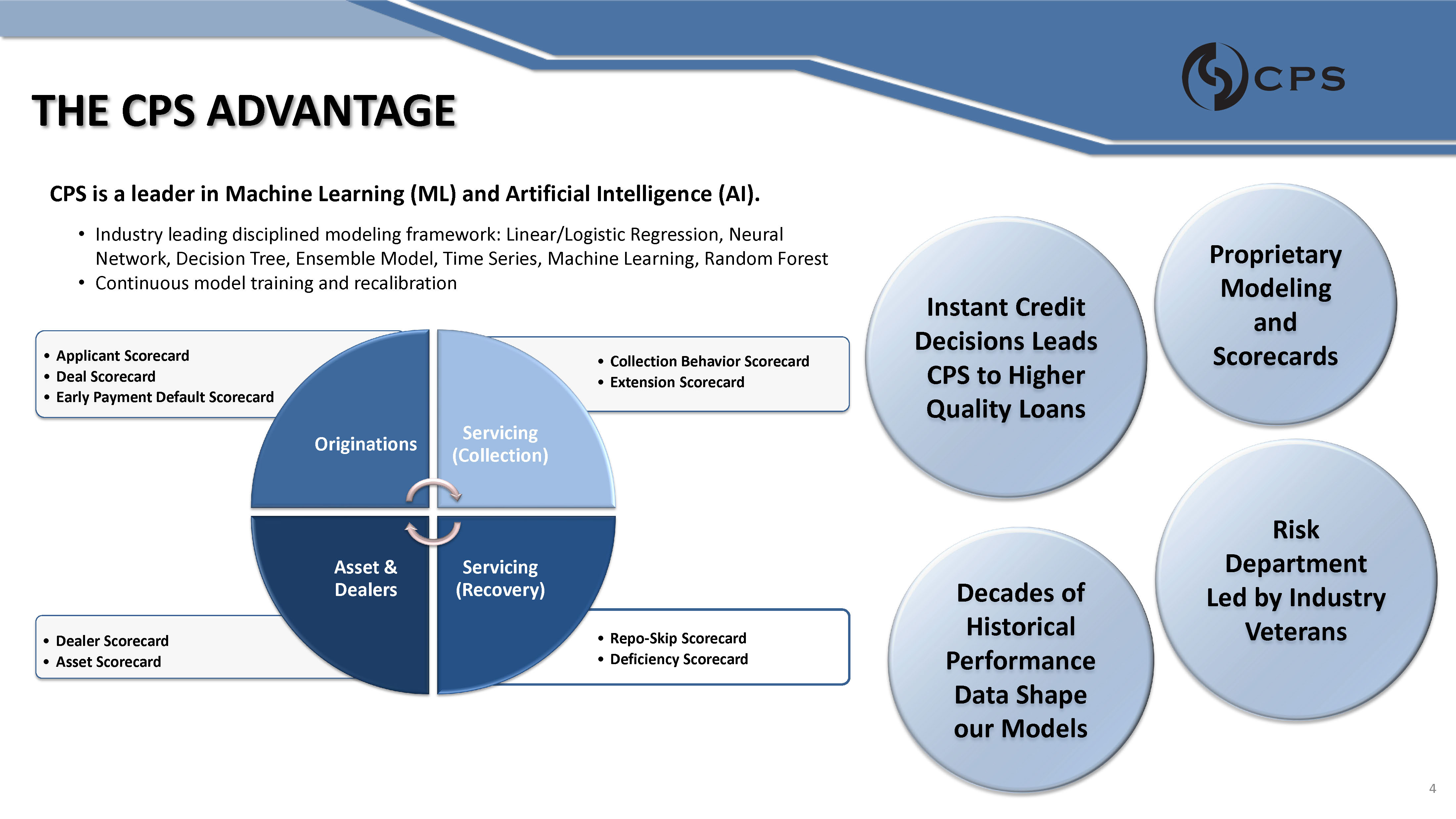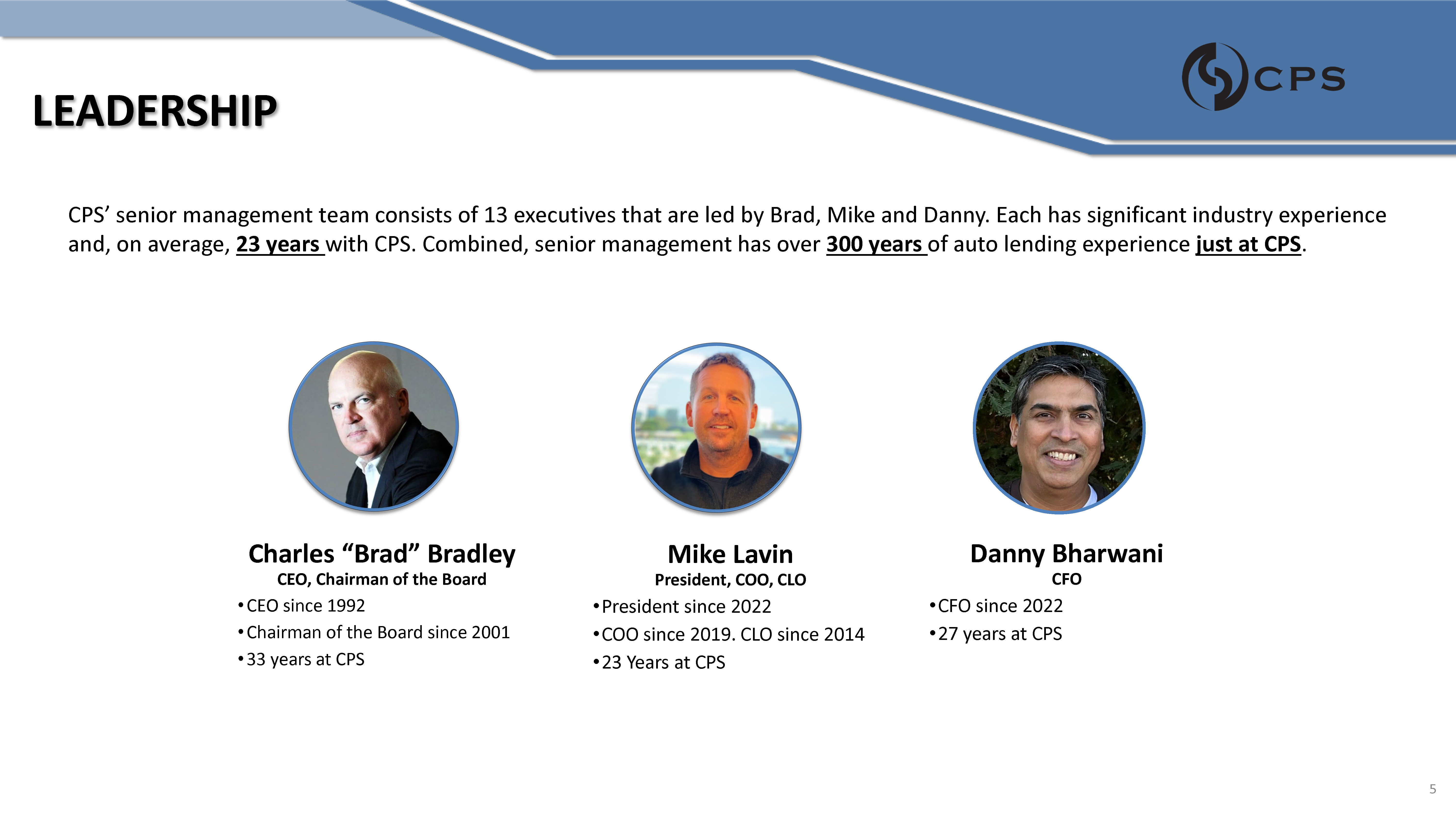 THE CPS ADVANTAGE • Repo - Skip Scorecard • Deficiency Scorecard • Dealer Scorecard • Asset Scorecard • Collection Behavior Scorecard • Extension Scorecard • Applicant Scorecard • Deal Scorecard • Early Payment Default Scorecard Originations Servicing (Collection) Servicing (Recovery) Asset & Dealers CPS is a leader in Machine Learning (ML) and Artificial Intelligence (AI). • Industry leading disciplined modeling framework: Linear/Logistic Regression, Neural Network, Decision Tree, Ensemble Model, Time Series, Machine Learning, Random Forest • Continuous model training and recalibration Proprietary Modeling and Scorecards Instant Credit Decisions Leads CPS to Higher Quality Loans Risk Department Led by Industry Veterans Decades of Historical Performance Data Shape our Models 4