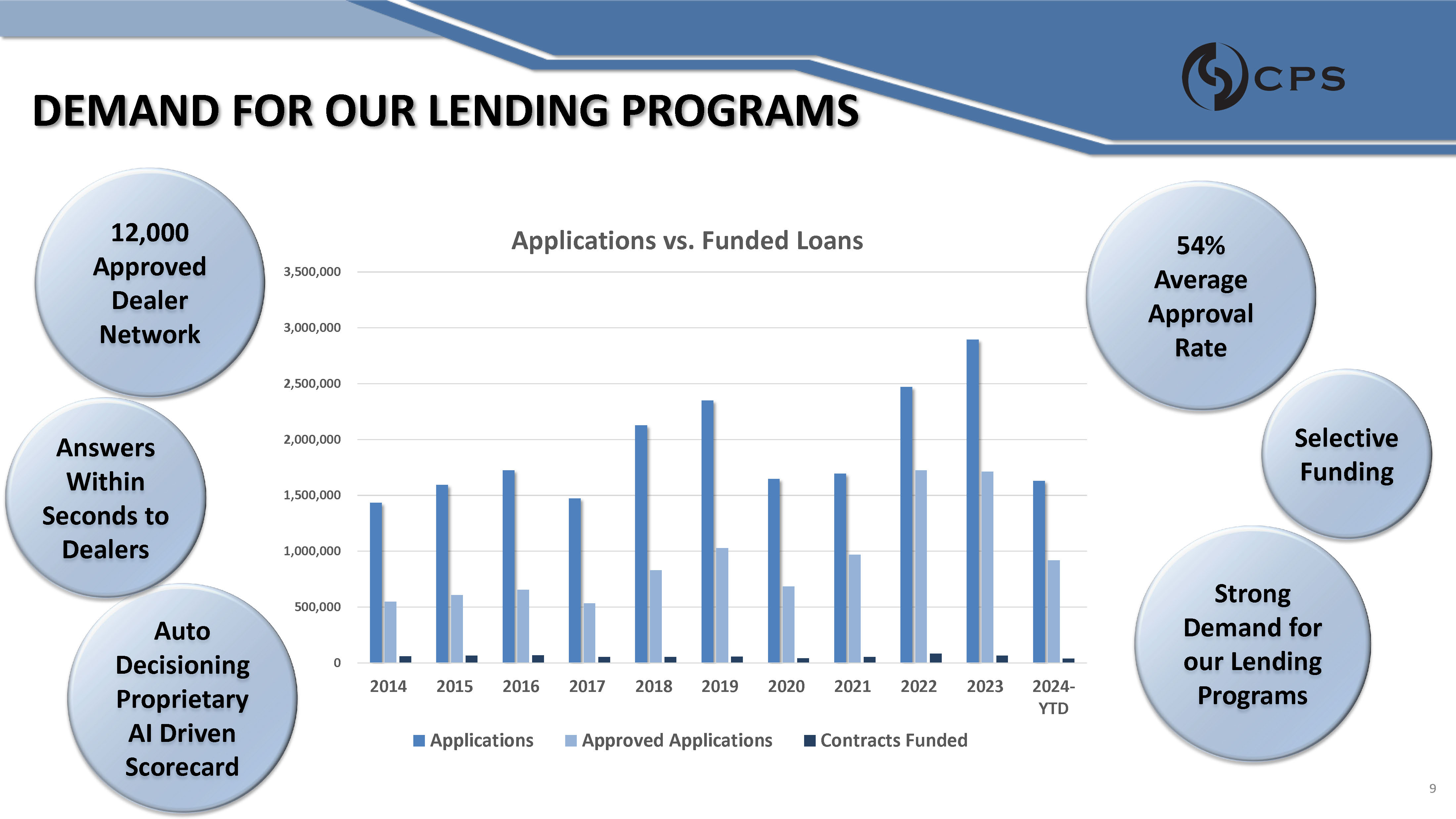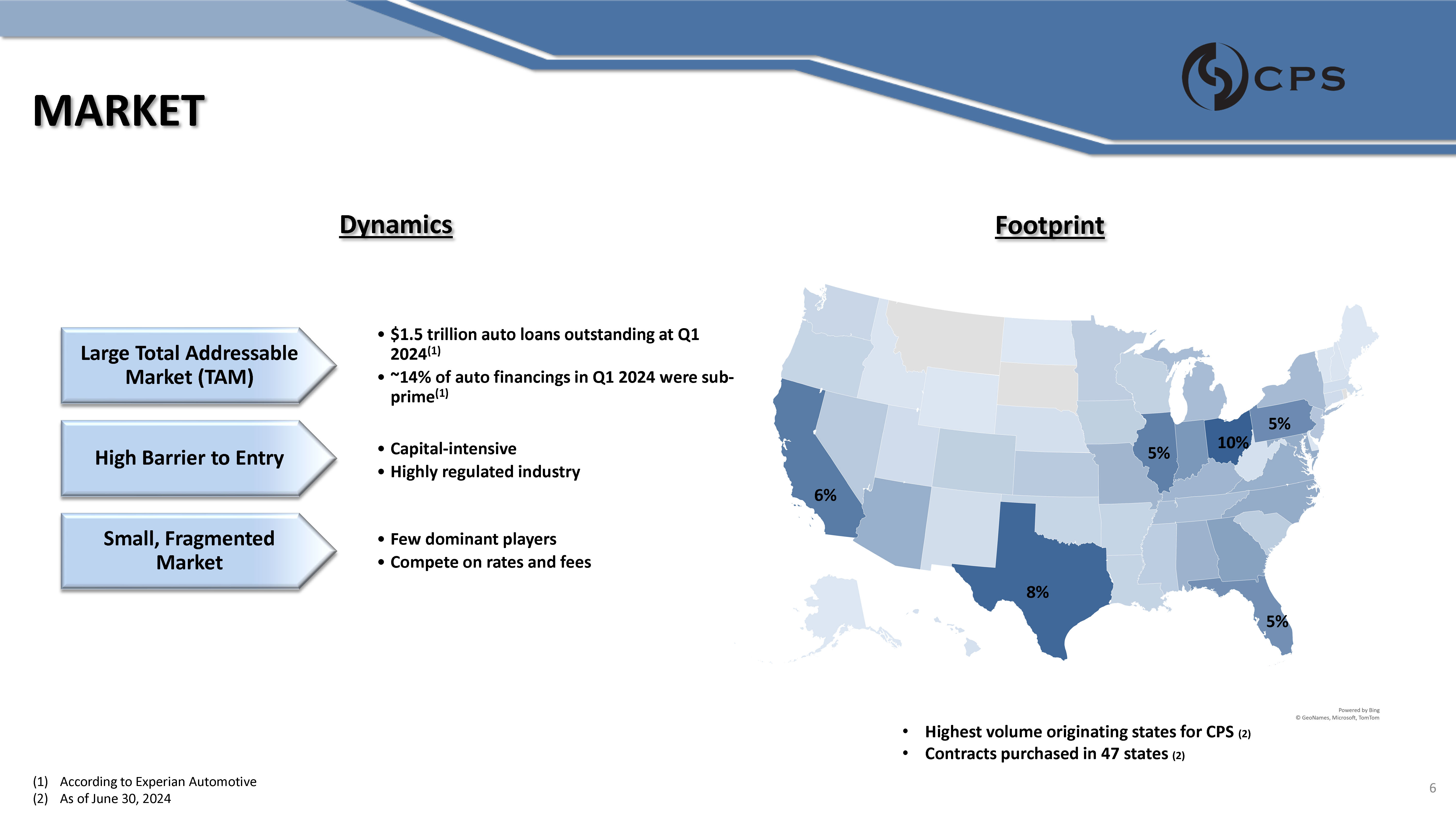 MARKET • $1.5 trillion auto loans outstanding at Q1 2024 (1) • ~14% of auto financings in Q1 2024 were sub - prime (1) Large Total Addressable Market (TAM) • Capital - intensive • Highly regulated industry High Barrier to Entry • Few dominant players • Compete on rates and fees Small, Fragmented Market Dynamics Footprint 6% 8% 10% 5% 5% 5% (1) According to Experian Automotive (2) As of June 30, 2024 • Highest volume originating states for CPS (2) • Contracts purchased in 47 states (2) 6