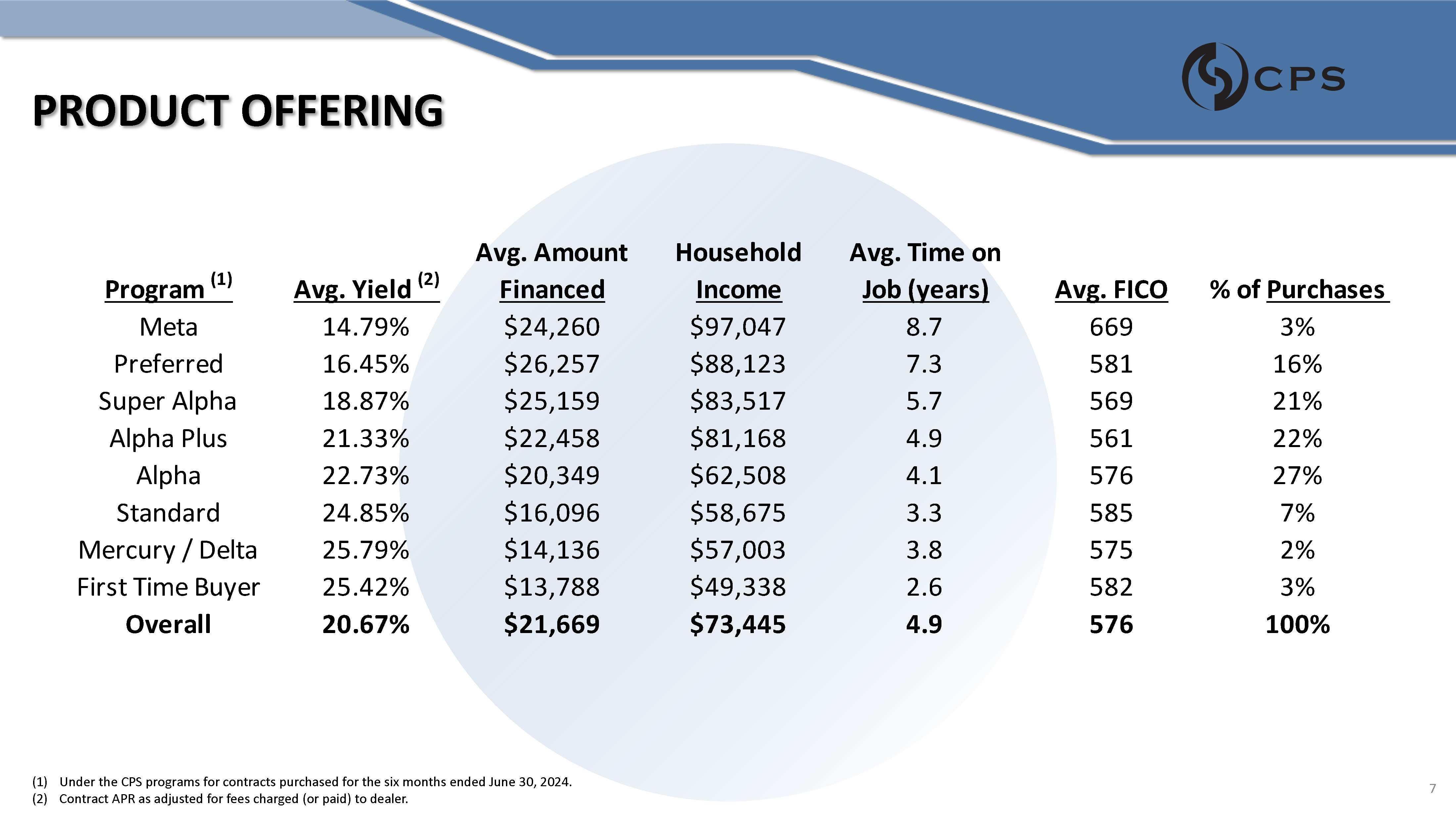 PRODUCT OFFERING % of Purchases Avg. FICO Avg. Time on Job (years) Household Income Avg. Amount Financed Avg. Yield (2) Program (1) 3% 669 8.7 $97,047 $24,260 14.79% Meta 16% 581 7.3 $88,123 $26,257 16.45% Preferred 21% 569 5.7 $83,517 $25,159 18.87% Super Alpha 22% 561 4.9 $81,168 $22,458 21.33% Alpha Plus 27% 576 4.1 $62,508 $20,349 22.73% Alpha 7% 585 3.3 $58,675 $16,096 24.85% Standard 2% 575 3.8 $57,003 $14,136 25.79% Mercury / Delta 3% 582 2.6 $49,338 $13,788 25.42% First Time Buyer 100% 576 4.9 $73,445 $21,669 20.67% Overall (1) Under the CPS programs for contracts purchased for the six months ended June 30, 2024. (2) Contract APR as adjusted for fees charged (or paid) to dealer. 7