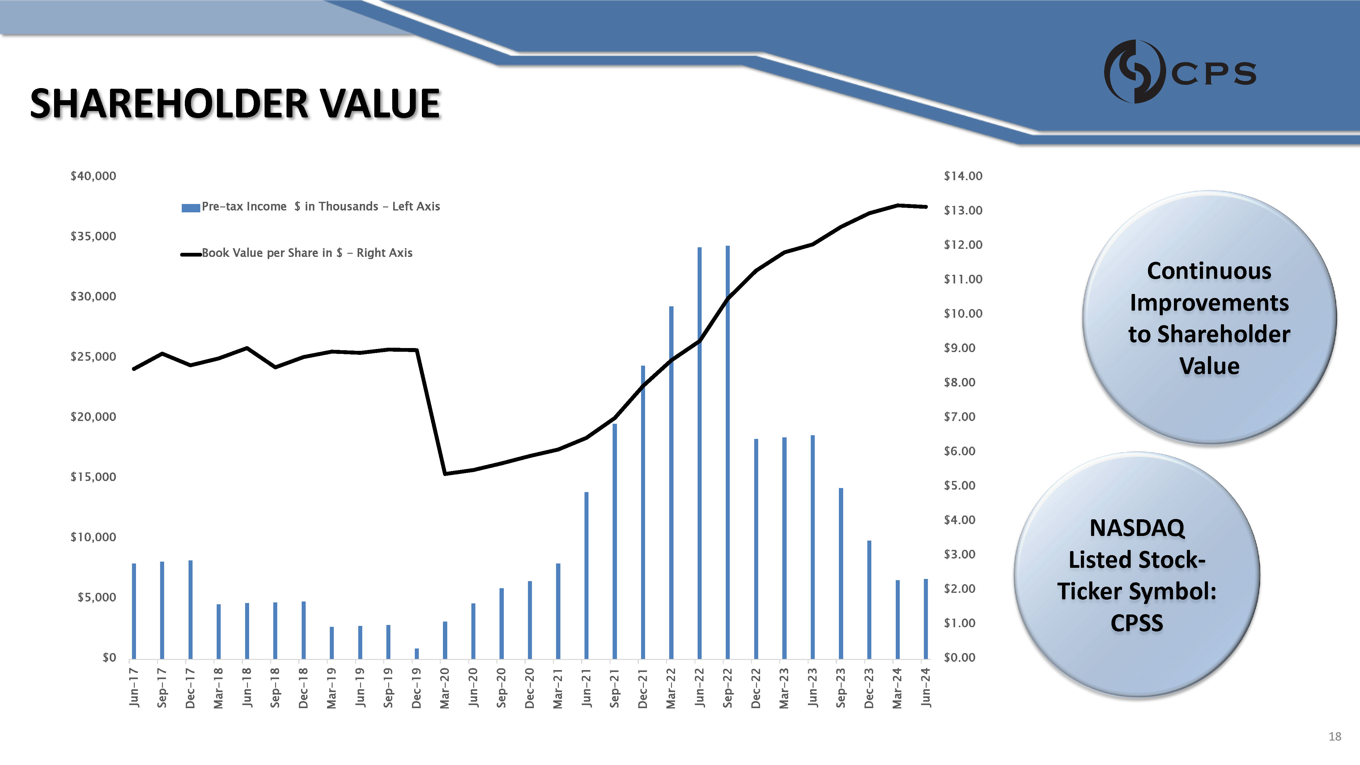 SHAREHOLDER VALUE $0 $5,000 $10,000 $15,000 $20,000 $25,000 $30,000 $35,000 $40,000 Jun - 17 Sep - 17 Dec - 17 Mar - 18 Jun - 18 Sep - 18 Dec - 18 Mar - 19 Jun - 19 Sep - 19 Dec - 19 Mar - 20 Jun - 20 Sep - 20 Dec - 20 Mar - 21 Jun - 21 Sep - 21 Dec - 21 Mar - 22 Jun - 22 Sep - 22 Dec - 22 Mar - 23 Jun - 23 Sep - 23 Dec - 23 Mar - 24 Jun - 24 $0.00 $1.00 $2.00 $3.00 $4.00 $5.00 $6.00 $7.00 $8.00 $9.00 $10.00 $11.00 $12.00 $13.00 $14.00 Pre - tax Income $ in Thousands - Left Axis Book Value per Share in $ - Right Axis Continuous Improvements to Shareholder Value NASDAQ Listed Stock - Ticker Symbol: CPSS 18