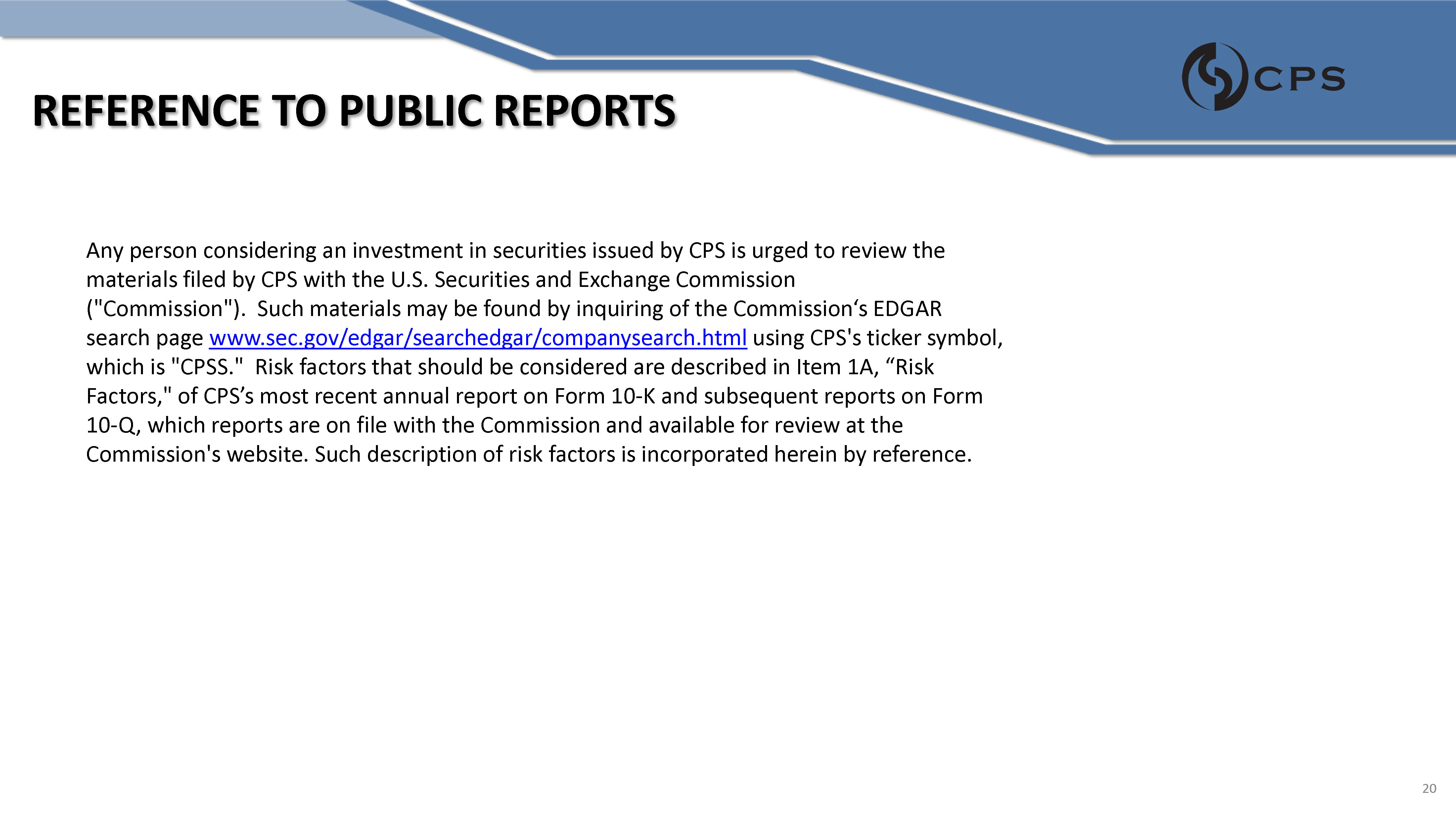 REFERENCE TO PUBLIC REPORTS Any person considering an investment in securities issued by CPS is urged to review the materials filed by CPS with the U.S. Securities and Exchange Commission ("Commission"). Such materials may be found by inquiring of the Commission‘s EDGAR search page www.sec.gov/edgar/searchedgar/companysearch.html using CPS's ticker symbol, which is "CPSS." Risk factors that should be considered are described in Item 1A, “Risk Factors," of CPS’s most recent annual report on Form 10 - K and subsequent reports on Form 10 - Q, which reports are on file with the Commission and available for review at the Commission's website. Such description of risk factors is incorporated herein by reference. 20