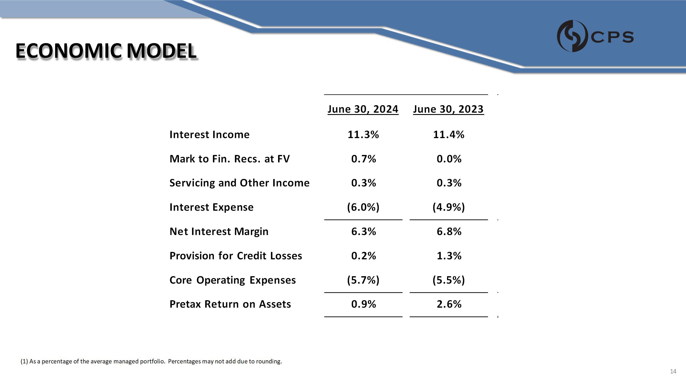 ECONOMIC MODEL June 30, 2023 June 30, 2024 11.4% 11.3% Interest Income 0.0% 0.7% Mark to Fin. Recs. at FV 0.3% 0.3% Servicing and Other Income (4.9%) (6.0%) Interest Expense 6.8% 6.3% Net Interest Margin 1.3% 0.2% Provision for Credit Losses (5.5%) (5.7%) Core Operating Expenses 2.6% 0.9% Pretax Return on Assets (1) As a percentage of the average managed portfolio. Percentages may not add due to rounding. 14