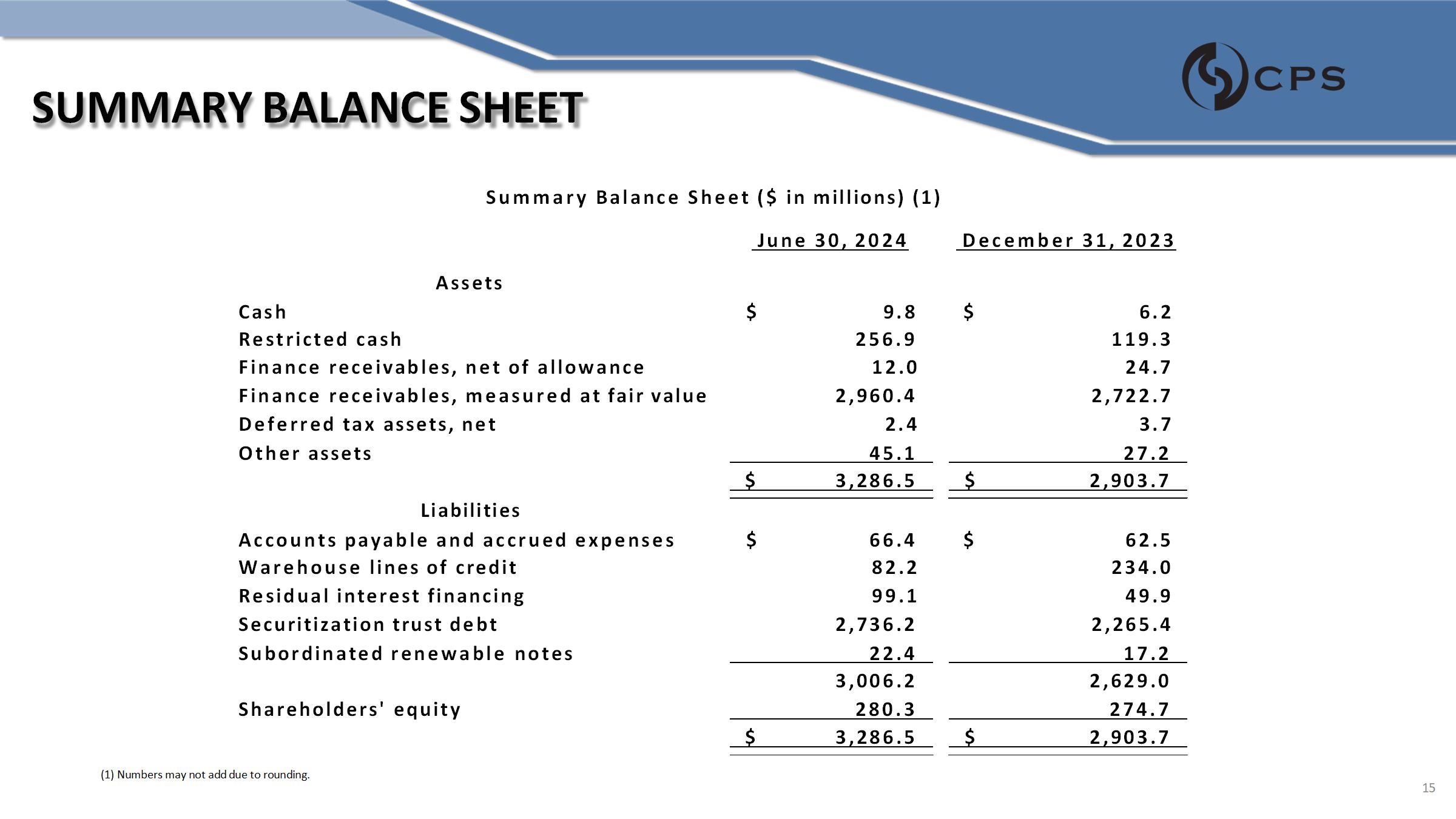 SUMMARY BALANCE SHEET June 30, 2024 December 31, 2023 Assets 6.2 $ $ 9.8 Cash 119.3 256.9 Restricted cash 24.7 12.0 Finance receivables, net of allowance 2,722.7 2,960.4 Finance receivables, measured at fair value 3.7 2.4 Deferred tax assets, net 27.2 45.1 Other assets $ 2,903.7 $ 3,286.5 Liabilities 62.5 $ $ 66.4 Accounts payable and accrued expenses 234.0 82.2 Warehouse lines of credit 49.9 99.1 Residual interest financing 2,265.4 2,736.2 Securitization trust debt 17.2 22.4 Subordinated renewable notes 2,629.0 3,006.2 274.7 280.3 Shareholders' equity $ 2,903.7 $ 3,286.5 Summary Balance Sheet ($ in millions) (1) (1) Numbers may not add due to rounding . 15