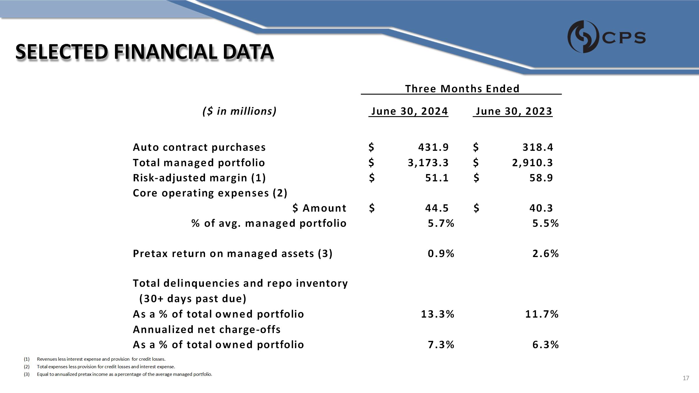 SELECTED FINANCIAL DATA June 30, 2023 June 30, 2024 ($ in millions) $ 318.4 $ 431.9 Auto contract purchases $ 2,910.3 $ 3,173.3 Total managed portfolio $ 58.9 $ 51.1 Risk - adjusted margin (1) Core operating expenses (2) $ 40.3 $ 44.5 $ Amount 5.5% 5.7% % of avg. managed portfolio 2.6% 0.9% Pretax return on managed assets (3) Total delinquencies and repo inventory (30+ days past due) 11.7% 13.3% As a % of total owned portfolio Annualized net charge - offs 6.3% 7.3% As a % of total owned portfolio for credit losses. 17 Three Months Ended (1) Revenues less interest expense and provision (2) Total expenses less provision for credit losses and interest expense. (3) Equal to annualized pretax income as a percentage of the average managed portfolio .
