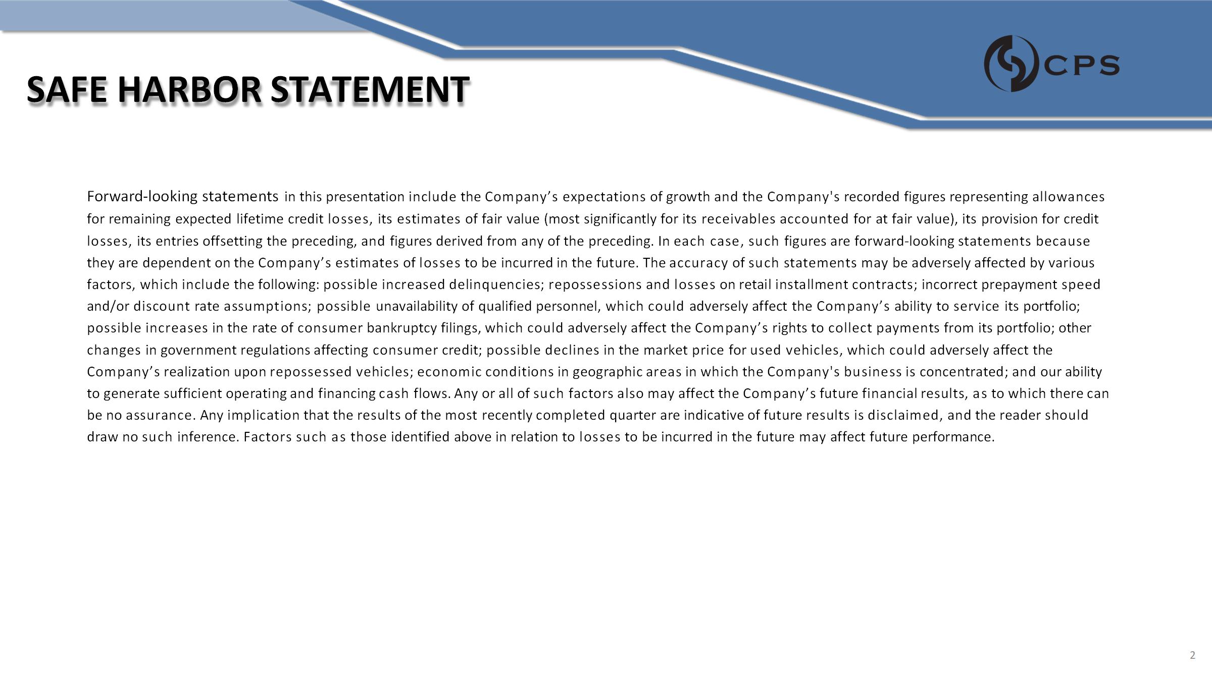 SAFE HARBOR STATEMENT Forward - looking statements in this presentation include the Company’s expectations of growth and the Company's recorded figures representing allowances for remaining expected lifetime credit losses, its estimates of fair value (most significantly for its receivables accounted for at fair value), its provision for credit losses, its entries offsetting the preceding, and figures derived from any of the preceding. In each case, such figures are forward - looking statements because they are dependent on the Company’s estimates of losses to be incurred in the future. The accuracy of such statements may be adversely affected by various factors, which include the following: possible increased delinquencies; repossessions and losses on retail installment contracts; incorrect prepayment speed and/or discount rate assumptions; possible unavailability of qualified personnel, which could adversely affect the Company’s ability to service its portfolio; possible increases in the rate of consumer bankruptcy filings, which could adversely affect the Company’s rights to collect payments from its portfolio; other changes in government regulations affecting consumer credit; possible declines in the market price for used vehicles, which could adversely affect the Company’s realization upon repossessed vehicles; economic conditions in geographic areas in which the Company's business is concentrated; and our ability to generate sufficient operating and financing cash flows. Any or all of such factors also may affect the Company’s future financial results, as to which there can be no assurance. Any implication that the results of the most recently completed quarter are indicative of future results is disclaimed, and the reader should draw no such inference. Factors such as those identified above in relation to losses to be incurred in the future may affect future performance. 2