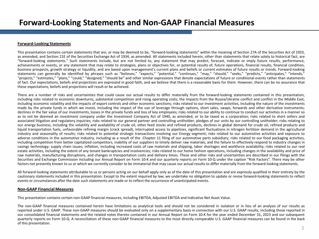 2 Forward - Looking Statements and Non - GAAP Financial Measures Forward - Looking Statements This presentation contains certain statements that are, or may be deemed to be, “forward - looking statements” within the meaning of Section 27 A of the Securities Act of 1933 , as amended, and Section 21 E of the Securities Exchange Act of 1934 , as amended . All statements included herein, other than statements that relate solely to historical fact, are “forward - looking statements . ” Such statements include, but are not limited to, any statement that may predict, forecast, indicate or imply future results, performance, achievements or events, or any statement that may relate to strategies, plans or objectives for, or potential results of, future operations, financial results, financial condition, business prospects, growth strategy or liquidity, and are based upon management’s current plans and beliefs or current estimates of future results or trends . Forward - looking statements can generally be identified by phrases such as “believes,” “expects,” “potential,” “continues,” “may,” “should,” “seeks,” “predicts,” “anticipates,” “intends,” “projects,” “estimates,” “plans,” “could,” “designed,” “should be” and other similar expressions that denote expectations of future or conditional events rather than statements of fact . Our expectations, beliefs and projections are expressed in good faith, and we believe that there is a reasonable basis for them . However, there can be no assurance that these expectations, beliefs and projections will result or be achieved . There are a number of risks and uncertainties that could cause our actual results to differ materially from the forward - looking statements contained in this presentation, including risks related to economic downturns, substantial competition and rising operating costs ; the impacts from the Russia/Ukraine conflict and conflict in the Middle East, including economic volatility and the impacts of export controls and other economic sanctions ; risks related to our investment activities, including the nature of the investments made by the private funds in which we invest, including the impact of the use of leverage through options, short sales, swaps, forwards and other derivative instruments ; declines in the fair value of our investments, losses in the private funds and loss of key employees ; risks related to our ability to continue to conduct our activities in a manner so as to not be deemed an investment company under the Investment Company Act of 1940 , as amended, or to be taxed as a corporation ; risks related to short sellers and associated litigation and regulatory inquiries ; risks related to our general partner and controlling unitholder ; pledges of our units by our controlling unitholder ; risks relating to our energy business, including the volatility and availability of crude oil, other feed stocks and refined products, declines in global demand for crude oil, refined products and liquid transportation fuels, unfavorable refining margin (crack spread), interrupted access to pipelines, significant fluctuations in nitrogen fertilizer demand in the agricultural industry and seasonality of results ; risks related to potential strategic transactions involving our Energy segment ; risks related to our automotive activities and exposure to adverse conditions in the automotive industry, including as a result of the Chapter 11 filing of our automotive parts subsidiary ; risks related to our food packaging activities, including competition from better capitalized competitors, inability of our suppliers to timely deliver raw materials, and the failure to effectively respond to industry changes in casings technology ; supply chain issues ; inflation, including increased costs of raw materials and shipping, labor shortages and workforce availability ; risks related to our real estate activities, including the extent of any tenant bankruptcies and insolvencies ; risks related to our home fashion operations, including changes in the availability and price of raw materials, manufacturing disruptions, and changes in transportation costs and delivery times . These and other risks and uncertainties are described in our filings with the Securities and Exchange Commission including our Annual Report on Form 10 - K and our quarterly reports on Form 10 - Q under the caption “Risk Factors” . There may be other factors not presently known to us or which we currently consider to be immaterial that may cause our actual results to differ materially from the forward - looking statements . All forward - looking statements attributable to us or persons acting on our behalf apply only as of the date of this presentation and are expressly qualified in their entirety by the cautionary statements included in this presentation . Except to the extent required by law, we undertake no obligation to update or revise forward - looking statements to reflect events or circumstances after the date such statements are made or to reflect the occurrence of unanticipated events . Non - GAAP Financial Measures This presentation contains certain non - GAAP financial measures, including EBITDA, Adjusted EBITDA and Indicative Net Asset Value . The non - GAAP financial measures contained herein have limitations as analytical tools and should not be considered in isolation or in lieu of an analysis of our results as reported under U . S . GAAP . These non - GAAP measures should be evaluated only on a supplementary basis in connection with our U . S . GAAP results, including those reported in our consolidated financial statements and the related notes thereto contained in our Annual Report on Form 10 - K for the year ended December 31 , 2023 and our subsequent quarterly reports on Form 10 - Q . A reconciliation of these non - GAAP financial measures to the most directly comparable U . S . GAAP finan