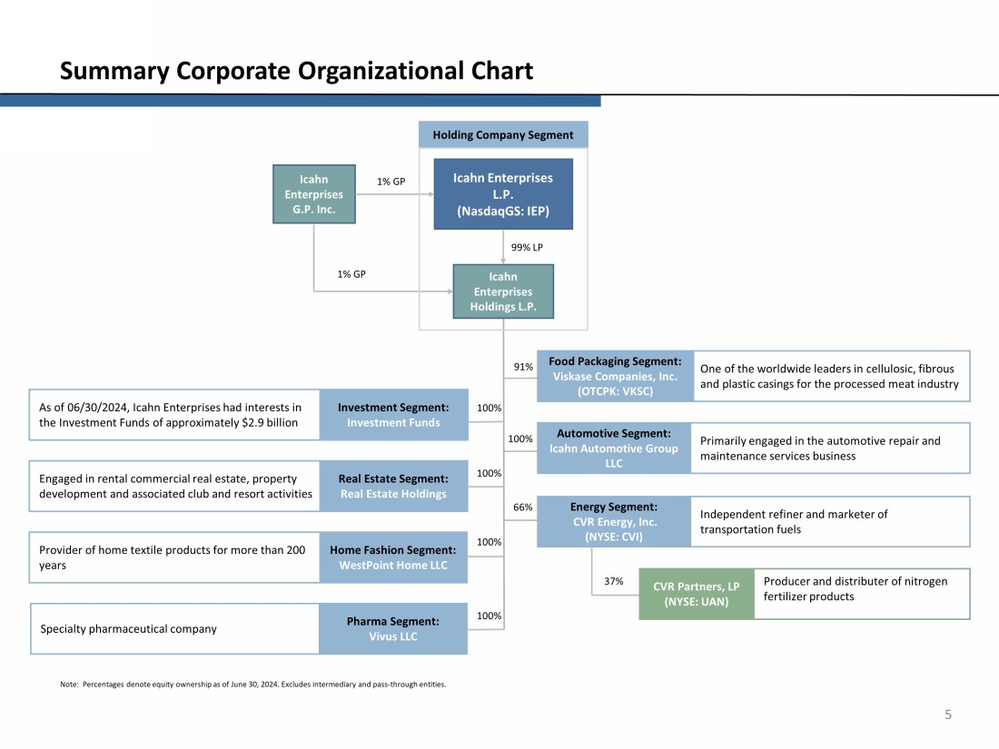 4 Overview of Icahn Enterprises (1) Based on August 8, 2024, closing price of $15.91 (2) Investment segment total assets represents total equity (equity attributable to IEP was $2.9 billion). • Icahn Enterprises L . P . (IEP) is a diversified holding company with operating businesses in Investment, Energy, Automotive, Real Estate, Food Packaging, Home Fashion and Pharma • IEP is majority owned and controlled by Carl Icahn • Over many years, Carl Icahn has contributed most of his businesses to and executed transactions primarily through IEP • As of June 30, 2024, Carl Icahn and his affiliates owned approximately 85% of IEP’s outstanding depositary units • As of August 8 , 2024 , IEP has a $ 4 . 00 annualized distribution, which is a 25 . 1 % yield ( 1 ) • IEP has liquidity through its investment in the Investment Funds of approximately $ 2 . 9 billion as of June 30 , 2024 Investment (2) $4,869 $0 ($595) ($595) Energy 4,522 8,553 347 631 Automotive 1,964 1,626 1 117 Food Packaging 449 417 4 50 Real Estate 494 133 11 25 Home Fashion 217 169 (6) 3 Pharma 272 102 5 33 Holding Company 1,848 0 (281) (33) $14,635 $11,000 ($514) $231 ($Millions) As of June 30, 2024 Twelve Months Ended June 30, 2024 Assets Net Income (Loss) Attributable to IEP Adjusted EBITDA Attributable to IEP Net Sales and Other Revenue from Operations