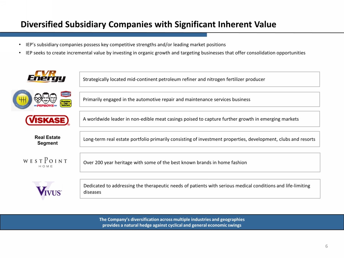 5 Summary Corporate Organizational Chart Note: Percentages denote equity ownership as of June 30, 2024. Excludes intermediary and pass - through entities. 99 % LP Energy Segment: CVR Energy , Inc. (NYSE: CVI) Pharma Segment: Vivus LLC Real Estate Segment: Real Estate Holdings Home Fashion Segment: WestPoint Home LLC Icahn Enterprises G.P. Inc. Icahn Enterprises L.P. ( NasdaqGS : IEP) Icahn Enterprises Holdings L.P. 1% GP 1% GP 91 % 66 % Investment Segment: Investment Funds Food Packaging Segment: Viskase Companies , Inc. (OTCPK: VKSC) As of 06/30/2024, Icahn Enterprises had interests in the Investment Funds of approximately $2.9 billion Engaged in rental commercial real estate, property development and associated club and resort activities Provider of home textile products for more than 200 years Specialty pharmaceutical company One of the worldwide leaders in cellulosic, fibrous and plastic casings for the processed meat industry Independent refiner and marketer of transportation fuels 100% 100% 100% 100% Automotive Segment: Icahn Automotive Group LLC Primarily e ngaged in the automotive repair and maintenance services business 100% Producer and distributer of nitrogen fertilizer products CVR Partners, LP (NYSE: UAN) 3 7 % Holding Company Segment