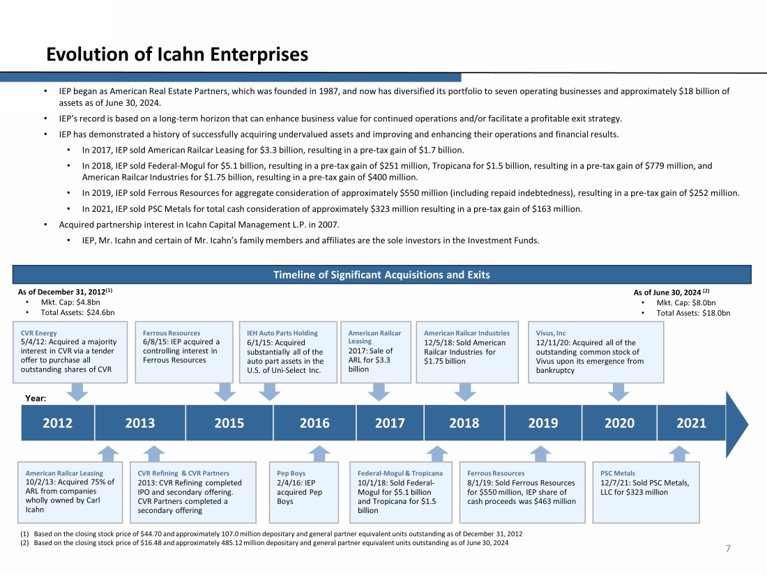 7 Evolution of Icahn Enterprises • IEP began as American Real Estate Partners, which was founded in 1987, and now has diversified its portfolio to seven operati ng businesses and approximately $18 billion of assets as of June 30, 2024. • IEP’s record is based on a long - term horizon that can enhance business value for continued operations and/or facilitate a profit able exit strategy. • IEP has demonstrated a history of successfully acquiring undervalued assets and improving and enhancing their operations and fin ancial results. • In 2017, IEP sold American Railcar Leasing for $3.3 billion, resulting in a pre - tax gain of $1.7 billion. • In 2018, IEP sold Federal - Mogul for $5.1 billion, resulting in a pre - tax gain of $251 million, Tropicana for $1.5 billion, resul ting in a pre - tax gain of $779 million, and American Railcar Industries for $1.75 billion, resulting in a pre - tax gain of $400 million. • In 2019, IEP sold Ferrous Resources for aggregate consideration of approximately $550 million (including repaid indebtedness) , r esulting in a pre - tax gain of $252 million. • In 2021, IEP sold PSC Metals for total cash consideration of approximately $323 million resulting in a pre - tax gain of $163 mill ion. • Acquired partnership interest in Icahn Capital Management L.P. in 2007. • IEP, Mr. Icahn and certain of Mr. Icahn’s family members and affiliates are the sole investors in the Investment Funds. Timeline of Significant Acquisitions and Exits (1) Based on the closing stock price of $44.70 and approximately 107.0 million depositary and general partner equivalent units outstanding a s of December 31, 2012 (2) Based on the closing stock price of $16.48 and approximately 485.12 million depositary and general partner equivalent u nit s outstanding as of June 30, 2024 As of December 31, 20 12 (1) • Mkt. Cap: $4.8 bn • Total Assets: $ 24.6 bn As of June 30, 2024 ( 2 ) • Mkt. Cap: $ 8.0b n • Total Assets: $ 18.0 bn Year: 201 2 201 3 2015 201 6 201 7 201 8 201 9 20 20 20 21 American Railcar Leasing 10/2/13: Acquired 75% of ARL from companies wholly owned by Carl Icahn Ferrous Resources 6/8/15: IEP acquired a controlling interest in Ferrous Resources Pep Boys 2/4/16: IEP acquired Pep Boys Federal - Mogul & Tropicana 10/1/18: Sold Federal - Mogul for $5.1 billion and Tropicana for $1.5 billion Ferrous Resources 8/1/19: Sold Ferrous Resources for $550 million, IEP share of cash proceeds was $4 63 million PSC Metals 12/7/21: Sold PSC Metals, LLC for $323 million CVR Energy 5/4/12: Acquired a majority interest in CVR via a tender offer to purchase all outstanding shares of CVR CVR Refining & CVR Partners 2013: CVR Refining completed IPO and secondary offering. CVR Partners completed a secondary offering IEH Auto Parts Holding 6/1/15: Acquired substantially all of the auto part assets in the U.S. of Uni - Select Inc. American Railcar Leasing 2017: Sale of ARL for $3 .3 billion American Railcar Industries 12/5/18: Sold American Railcar Industries for $1.75 billion Vivus , Inc 12/11/20: Acquired all of the outstanding common stock of Vivus upon its emergence from bankruptcy