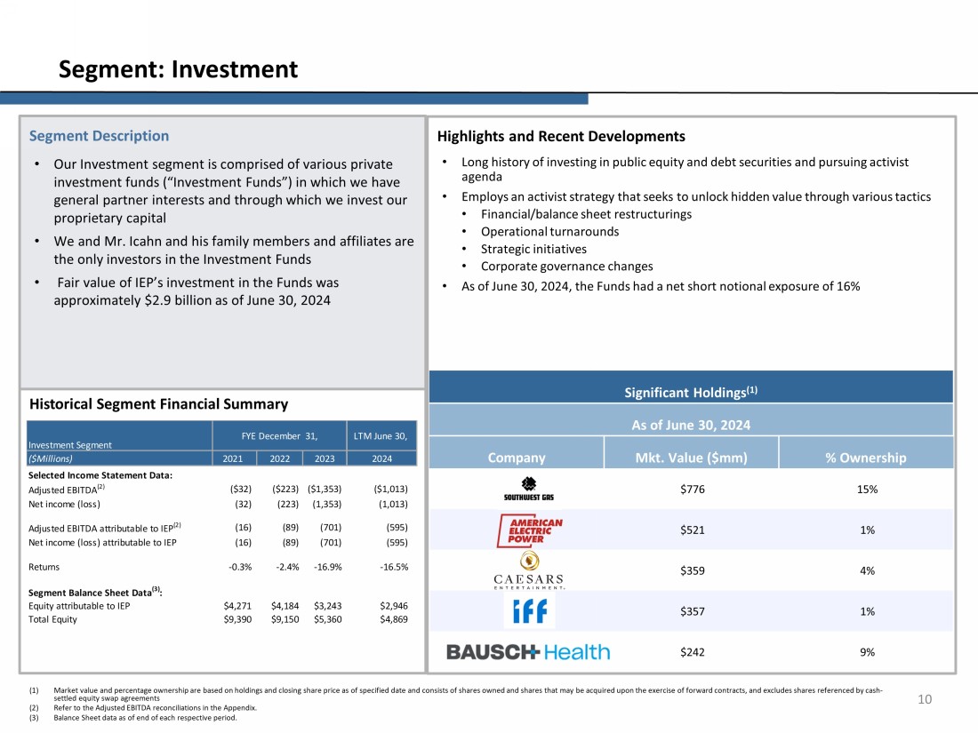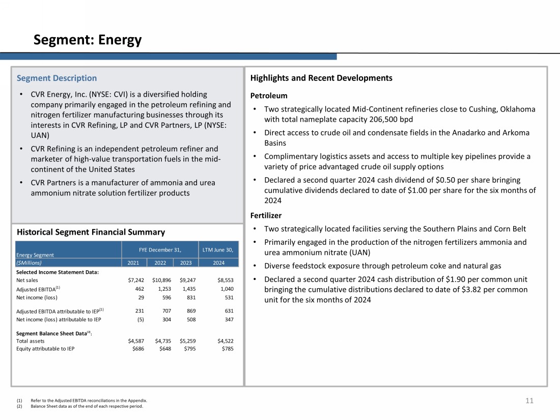Highlights and Recent Developments • Long history of investing in public equity and debt securities and pursuing activist agenda • Employs an activist strategy that seeks to unlock hidden value through various tactics • Financial/balance sheet restructurings • Operational turnarounds • Strategic initiatives • Corporate governance changes • As of June 30, 2024, the Funds had a net short notional exposure of 16% Segment Description • Our Investment segment is comprised of various private investment funds (“Investment Funds”) in which we have general partner interests and through which we invest our proprietary capital • We and Mr. Icahn and his family members and affiliates are the only investors in the Investment Funds • Fair value of IEP’s investment in the Funds was approximately $2.9 billion as of June 30, 2024 10 Segment: Investment Historical Segment Financial Summary (1) Market value and percentage ownership are based on holdings and closing share price as of specified date and consists of shar es owned and shares that may be acquired upon the exercise of forward contracts, and excludes shares referenced by cash - settled equity swap agreements (2) Refer to the Adjusted EBITDA reconciliations in the Appendix . (3) Balance Sheet data as of end of each respective period. Significant Holdings (1) As of June 30, 2024 Company Mkt. Value ($mm) % Ownership $776 15 % $ 521 1 % $359 4% $ 357 1 % $ 242 9 % ($Millions) 2021 Selected Income Statement Data: Adjusted EBITDA (2) ($32) ($223) ($1,353) ($1,013) Net income (loss) (32) (223) (1,353) (1,013) Adjusted EBITDA attributable to IEP (2) (16) (89) (701) (595) Net income (loss) attributable to IEP (16) (89) (701) (595) Returns -0.3% -2.4% -16.9% -16.5% Segment Balance Sheet Data (3) : Equity attributable to IEP $4,271 $4,184 $3,243 $2,946 Total Equity $9,390 $9,150 $5,360 $4,869 Investment Segment FYE December 31, LTM June 30, 20242022 2023