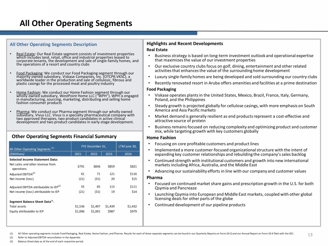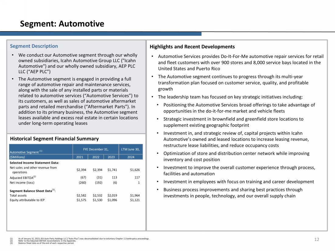 Highlights and Recent Developments • Automotive Services provides Do - It - For - Me automotive repair services for retail and fleet customers with over 900 stores and 8,000 service bays located in the United States and Puerto Rico • The Automotive segment continues to progress through its multi - year transformation plan focused on customer service, quality, and profitable growth • The leadership team has focused on key strategic initiatives including: • Positioning the Automotive Services broad offerings to take advantage of opportunities in the do - it - for - me market and vehicle fleets • Strategic investment in brownfield and greenfield store locations to supplement existing geographic footprint • Investment in, and strategic review of, capital projects within Icahn Automotive’s owned and leased locations to increase leasing revenue, restructure lease liabilities, and reduce occupancy costs • Optimization of s tore and distribution center network while improving inventory and cost position • Investment to improve the overall customer experience through process, facilities and automation • Investment in employees with focus on training and career development • Business process improvements and sharing best practices through investments in people, technology, and our overall supply chain Segment Description • We conduct our Automotive segment through our wholly owned subsidiaries, Icahn Automotive Group LLC ("Icahn Automotive") and our wholly owned subsidiary, AEP PLC LLC (“AEP PLC”) • The Automotive segment is engaged in providing a full range of automotive repair and maintenance services, along with the sale of any installed parts or materials related to automotive services (“Automotive Services”) to its customers, as well as sales of automotive aftermarket parts and retailed merchandise (“Aftermarket Parts”). In addition to its primary business, the Automotive segment leases available and excess real estate in certain locations under long - term operating leases 12 Segment: Automotive Historical Segment Financial Summary (1) As of January 31, 2023, IEH Auto Parts Holdings LLC (“Auto Plus”) was deconsolidated due to voluntary Chapter 11 bankruptcy p roc eedings. (2) Refer to the Adjusted EBITDA reconciliations in the Appendix . (3) Balance Sheet data as of the end of each respective period . ($Millions) 2021 Selected Income Statement Data: Net sales and other revenue from operations $2,394 $2,394 $1,741 $1,626 Adjusted EBITDA (2) (67) (31) 113 117 Net income (loss) (260) (192) (6) 1 Segment Balance Sheet Data (3) : Total assets $2,582 $2,532 $2,019 $1,964 Equity attributable to IEP $1,575 $1,530 $1,096 $1,121 Automotive Segment (1) FYE December 31, LTM June 30, 20242022 2023