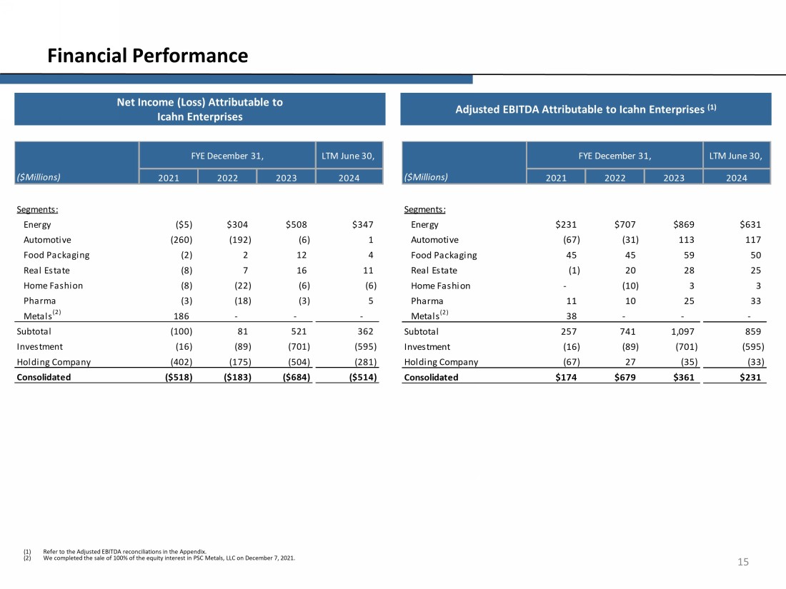 Highlights and Recent Developments Real Estate • Business strategy is based on long - term investment outlook and operational expertise that maximizes the value of our investment properties • Our exclusive country clubs focus on golf, dining, entertainment and other related activities that enhances the value of the surrounding home development • Luxury single - family homes are being developed and sold surrounding our country clubs • Recently renovated resort in Aruba offers amenities and facilities at a prime destination Food Packaging • Viskase operates plants in the United States, Mexico, Brazil, France, Italy, Germany, Poland, and the Philippines • Steady growth is projected globally for cellulose casings, with more emphasis on South America and Asia Pacific markets • Market demand is generally resilient as end products represent a cost - effective and attractive source of protein • Business remains focused on reducing complexity and optimizing product and customer mix, while targeting growth with key customers globally Home Fashion • Focusing on core profitable customers and product lines • Implemented a more customer - focused organizational structure with the intent of expanding key customer relationships and rebuilding the company’s sales backlog • Continued strength with institutional customers and growth into new international markets including Africa, Australia, and the Middle East • Advancing our sustainability efforts in line with our company and customer values Pharma • Focused on continued market share gains and prescription growth in the U.S. for both Qsymia and Pancreaze • Launching Qsymia into European and Middle East markets, coupled with other global licensing deals for other parts of the globe • Continued development of our pipeline products All Other Operating Segments Description • Real Estate : Our Real Estate segment consists of investment properties which includes land, retail, office and industrial properties leased to corporate tenants, the development and sale of single - family homes, and the operations of a resort and country clubs • Food Packaging : We conduct our Food Packaging segment through our majority owned subsidiary, Viskase Companies, Inc. (OTCPK:VKSC), a worldwide leader in the production and sale of cellulosic, fibrous and plastic casings for the processed meat and poultry industry • Home Fashion : We conduct our Home Fashion segment through our wholly owned subsidiary, WestPoint Home LLC (“WPH”). WPH is engaged in manufacturing, sourcing, marketing, distributing and selling home fashion consumer products • Pharma : We conduct our Pharma segment through our wholly owned subsidiary, Vivus LLC. Vivus is a specialty pharmaceutical company with two approved therapies, two product candidates in active clinical development and two product candidates in early - stage development. 13 All Other Operating Segments Other Operating Segments Financial Summary (1) All Other operating segments include Food Packaging, Real Estate, Home Fashion, and Pharma. Results for each of these separat e s egments can be found in our Quarterly Reports on Form 10 - Q and our Annual Report on Form 10 - K filed with the SEC. (2) Refer to Adjusted EBITDA reconciliation in the Appendix. (3) Balance Sheet data as of the end of each respective period. ($Millions) 2021 Selected Income Statement Data: Net sales and other revenue from operations $791 $836 $859 $821 Adjusted EBITDA (2) 61 71 121 $116 Net income (loss) (21) (31) 20 $15 Adjusted EBITDA attributable to IEP (2) 55 65 115 $111 Net income (loss) attributable to IEP (21) (31) 19 $14 Segment Balance Sheet Data (3) : Total assets $1,536 $1,497 $1,439 $1,432 Equity attributable to IEP $1,006 $1,001 $987 $979 2022 2023 2024 All Other Operating Segments (1) FYE December 31, LTM June 30,