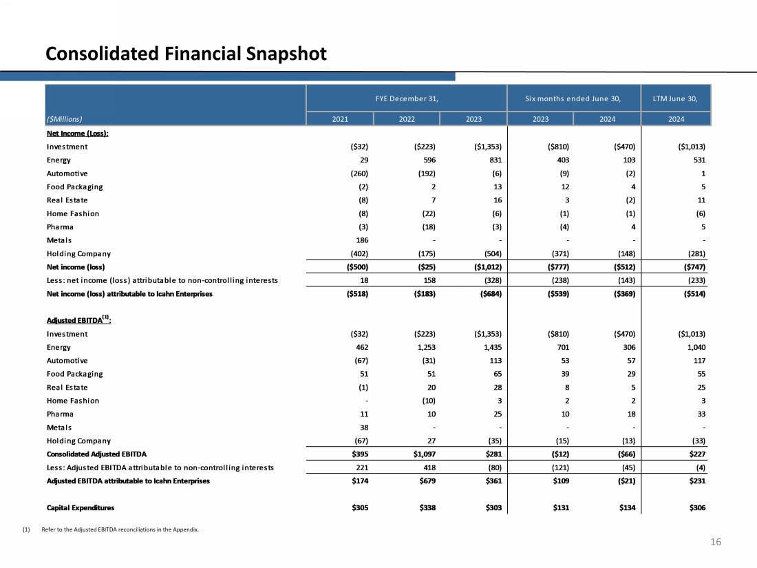 15 Financial Performance Net Income (Loss) Attributable to Icahn Enterprises Adjusted EBITDA Attributable to Icahn Enterprises (1) (1) Refer to the Adjusted EBITDA reconciliations in the Appendix. (2) We completed the sale of 100% of the equity interest in PSC Metals, LLC on December 7, 2021. ($Millions) Segments: Energy ($5) $304 $508 $347 Automotive (260) (192) (6) 1 Food Packaging (2) 2 12 4 Real Estate (8) 7 16 11 Home Fashion (8) (22) (6) (6) Pharma (3) (18) (3) 5 Metals (2) 186 - - - Subtotal (100) 81 521 362 Investment (16) (89) (701) (595) Holding Company (402) (175) (504) (281) Consolidated ($518) ($183) ($684) ($514) FYE December 31, LTM June 30, 2021 2022 2023 2024 ($Millions) Segments: Energy $231 $707 $869 $631 Automotive (67) (31) 113 117 Food Packaging 45 45 59 50 Real Estate (1) 20 28 25 Home Fashion - (10) 3 3 Pharma 11 10 25 33 Metals (2) 38 - - - Subtotal 257 741 1,097 859 Investment (16) (89) (701) (595) Holding Company (67) 27 (35) (33) Consolidated $174 $679 $361 $231 2024 LTM June 30, FYE December 31, 2021 2022 2023