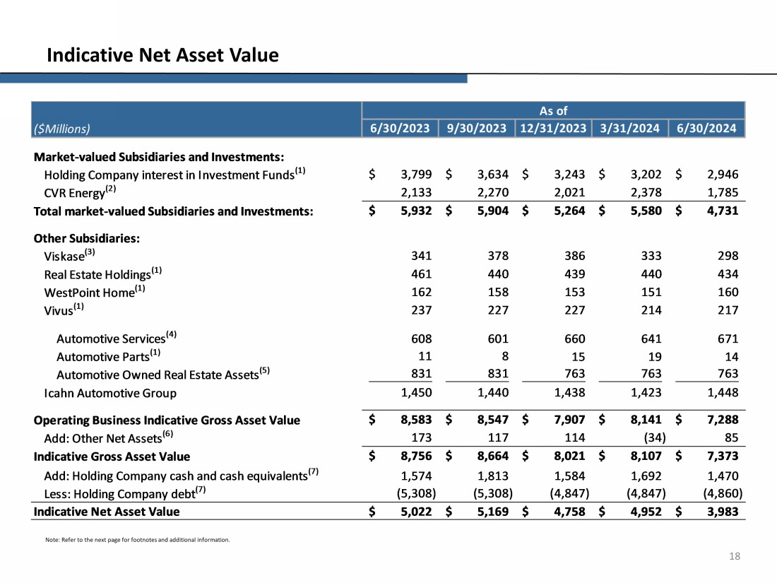 17 Balance Sheet (1) All Other operating segments includes Food Packaging, Real Estate, Home Fashion, and Pharma. ($Millions) ASSETS Cash and cash equivalents $8 $586 $89 $5 $26 $4 $30 $1,470 $2,218 Cash held at consolidated affiliated partnerships and restricted cash 3,256 - 7 - 3 3 - 173 3,442 Investments 2,196 96 - - 14 - - - 2,306 Accounts receivable, net - 298 34 87 17 28 30 - 494 Inventories, net - 543 198 115 - 92 22 - 970 Related party notes receivable, net - - - - - - - 7 7 Property, plant and equipment, net - 2,542 817 126 367 53 - 4 3,909 Goodwill and intangible assets, net - 169 331 22 - 19 184 - 725 Other assets 2,762 288 488 94 67 18 6 194 3,917 Total assets $8,222 $4,522 $1,964 $449 $494 $217 $272 $1,848 $17,988 LIABILITIES AND EQUITY Accounts payable, accrued expenses and other liabilities $1,225 $1,438 $816 $126 $54 $43 $55 $92 $3,849 Securities sold, not yet purchased, at fair value 2,128 - - - - - - - 2,128 Debt - 1,584 27 139 1 14 - 4,860 6,625 Total liabilities $3,353 $3,022 $843 $265 $55 $57 $55 $4,952 $12,602 Equity attributable to Icahn Enterprises $2,946 $785 $1,121 $168 $434 $160 $217 ($3,104) $2,727 Equity attributable to non-controlling interests 1,923 715 - 16 5 - - - 2,659 Total equity $4,869 $1,500 $1,121 $184 $439 $160 $217 ($3,104) $5,386 Total liabilities and equity $8,222 $4,522 $1,964 $449 $494 $217 $272 $1,848 $17,988 As of June 30, 2024 Investment Energy Automotive Food Packaging (1) Consolidated Real Estate (1) Home Fashion (1) Pharma (1) Holding Company
