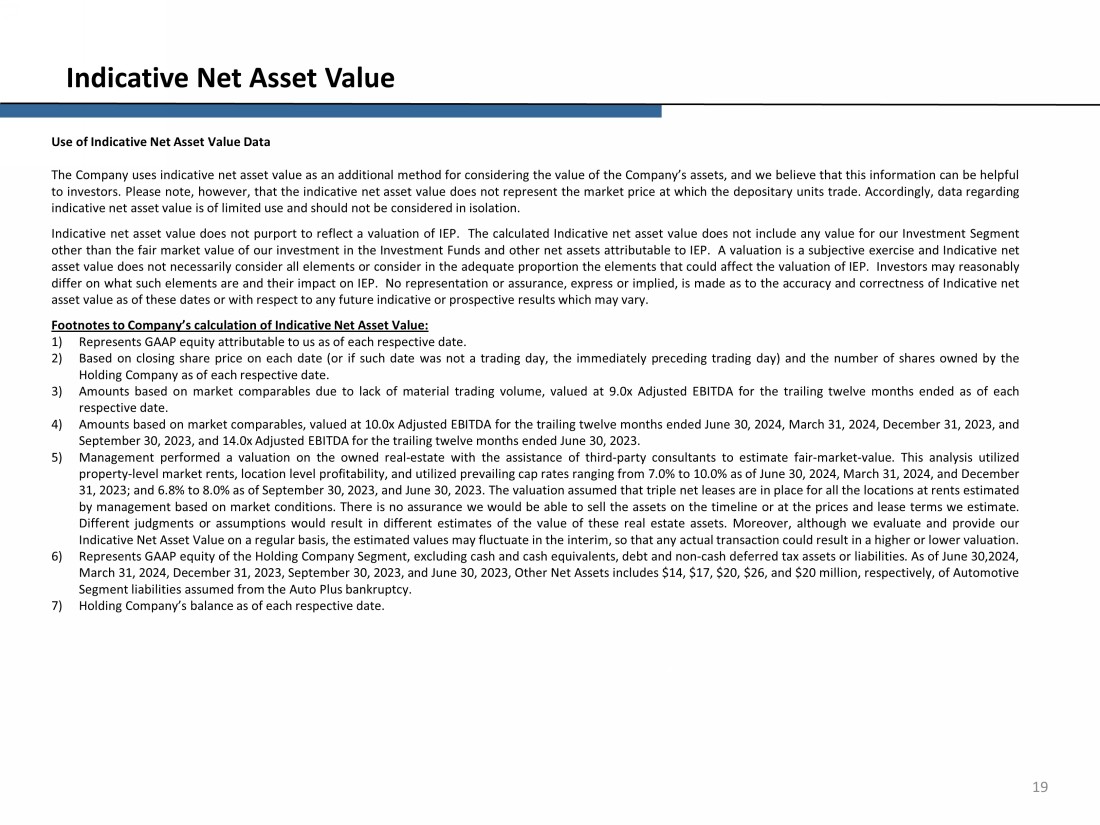19 Indicative Net Asset Value Use of Indicative Net Asset Value Data The Company uses indicative net asset value as an additional method for considering the value of the Company’s assets, and we believe that this information can be helpful to investors . Please note, however, that the indicative net asset value does not represent the market price at which the depositary units trade . Accordingly, data regarding indicative net asset value is of limited use and should not be considered in isolation . Indicative net asset value does not purport to reflect a valuation of IEP . The calculated Indicative net asset value does not include any value for our Investment Segment other than the fair market value of our investment in the Investment Funds and other net assets attributable to IEP . A valuation is a subjective exercise and Indicative net asset value does not necessarily consider all elements or consider in the adequate proportion the elements that could affect the valuation of IEP . Investors may reasonably differ on what such elements are and their impact on IEP . No representation or assurance, express or implied, is made as to the accuracy and correctness of Indicative net asset value as of these dates or with respect to any future indicative or prospective results which may vary . Footnotes to Company’s calculation of Indicative Net Asset Value: 1) Represents GAAP equity attributable to us as of each respective date . 2) Based on closing share price on each date (or if such date was not a trading day, the immediately preceding trading day) and the number of shares owned by the Holding Company as of each respective date . 3) Amounts based on market comparables due to lack of material trading volume, valued at 9 . 0 x Adjusted EBITDA for the trailing twelve months ended as of each respective date . 4) Amounts based on market comparables , valued at 10 . 0 x Adjusted EBITDA for the trailing twelve months ended June 30 , 2024 , March 31 , 2024 , December 31 , 2023 , and September 30 , 2023 , and 14 . 0 x Adjusted EBITDA for the trailing twelve months ended June 30 , 2023 . 5) Management performed a valuation on the owned real - estate with the assistance of third - party consultants to estimate fair - market - value . This analysis utilized property - level market rents, location level profitability, and utilized prevailing cap rates ranging from 7 . 0 % to 10 . 0 % as of June 30 , 2024 , March 31 , 2024 , and December 31 , 2023 ; and 6 . 8 % to 8 . 0 % as of September 30 , 2023 , and June 30 , 2023 . The valuation assumed that triple net leases are in place for all the locations at rents estimated by management based on market conditions . There is no assurance we would be able to sell the assets on the timeline or at the prices and lease terms we estimate . Different judgments or assumptions would result in different estimates of the value of these real estate assets . Moreover, although we evaluate and provide our Indicative Net Asset Value on a regular basis, the estimated values may fluctuate in the interim, so that any actual transaction could result in a higher or lower valuation . 6) Represents GAAP equity of the Holding Company Segment, excluding cash and cash equivalents, debt and non - cash deferred tax assets or liabilities . As of June 30 , 2024 , March 31 , 2024 , December 31 , 2023 , September 30 , 2023 , and June 30 , 2023 , Other Net Assets includes $ 14 , $ 17 , $ 20 , $ 26 , and $ 20 million, respectively, of Automotive Segment liabilities assumed from the Auto Plus bankruptcy . 7) Holding Company’s balance as of each respective date .