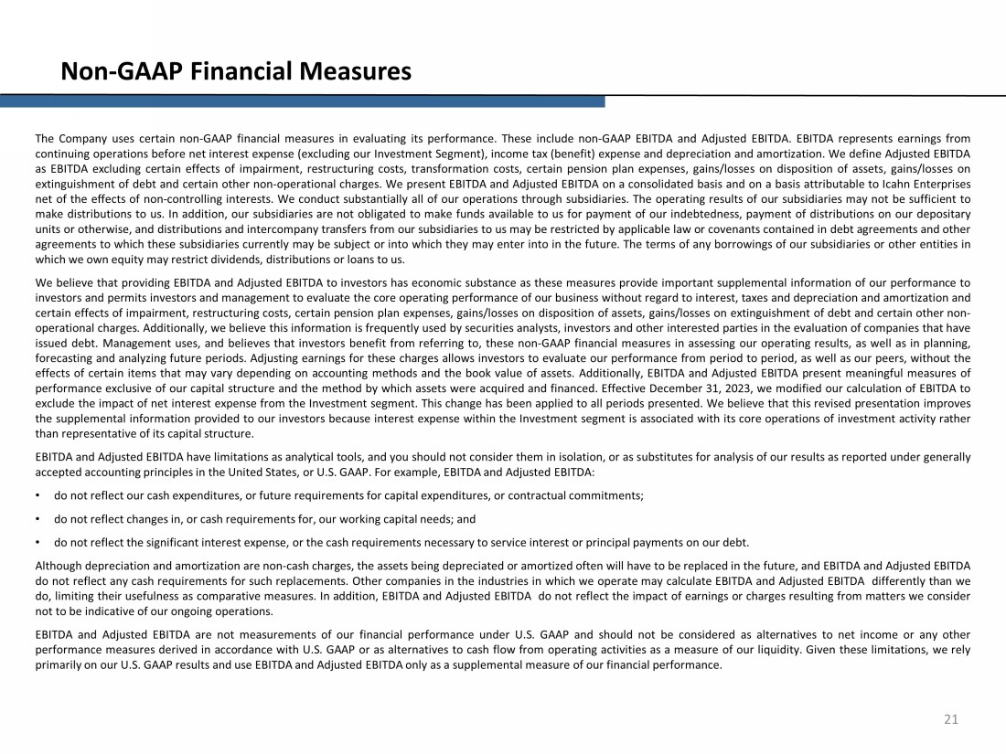 21 Non - GAAP Financial Measures The Company uses certain non - GAAP financial measures in evaluating its performance . These include non - GAAP EBITDA and Adjusted EBITDA . EBITDA represents earnings from continuing operations before net interest expense (excluding our Investment Segment), income tax (benefit) expense and depreciation and amortization . We define Adjusted EBITDA as EBITDA excluding certain effects of impairment, restructuring costs, transformation costs, certain pension plan expenses, gains/losses on disposition of assets, gains/losses on extinguishment of debt and certain other non - operational charges . We present EBITDA and Adjusted EBITDA on a consolidated basis and on a basis attributable to Icahn Enterprises net of the effects of non - controlling interests . We conduct substantially all of our operations through subsidiaries . The operating results of our subsidiaries may not be sufficient to make distributions to us . In addition, our subsidiaries are not obligated to make funds available to us for payment of our indebtedness, payment of distributions on our depositary units or otherwise, and distributions and intercompany transfers from our subsidiaries to us may be restricted by applicable law or covenants contained in debt agreements and other agreements to which these subsidiaries currently may be subject or into which they may enter into in the future . The terms of any borrowings of our subsidiaries or other entities in which we own equity may restrict dividends, distributions or loans to us . We believe that providing EBITDA and Adjusted EBITDA to investors has economic substance as these measures provide important supplemental information of our performance to investors and permits investors and management to evaluate the core operating performance of our business without regard to interest, taxes and depreciation and amortization and certain effects of impairment, restructuring costs, certain pension plan expenses, gains/losses on disposition of assets, gains/losses on extinguishment of debt and certain other non - operational charges . Additionally, we believe this information is frequently used by securities analysts, investors and other interested parties in the evaluation of companies that have issued debt . Management uses, and believes that investors benefit from referring to, these non - GAAP financial measures in assessing our operating results, as well as in planning, forecasting and analyzing future periods . Adjusting earnings for these charges allows investors to evaluate our performance from period to period, as well as our peers, without the effects of certain items that may vary depending on accounting methods and the book value of assets . Additionally, EBITDA and Adjusted EBITDA present meaningful measures of performance exclusive of our capital structure and the method by which assets were acquired and financed . Effective December 31 , 2023 , we modified our calculation of EBITDA to exclude the impact of net interest expense from the Investment segment . This change has been applied to all periods presented . We believe that this revised presentation improves the supplemental information provided to our investors because interest expense within the Investment segment is associated with its core operations of investment activity rather than representative of its capital structure . EBITDA and Adjusted EBITDA have limitations as analytical tools, and you should not consider them in isolation, or as substitutes for analysis of our results as reported under generally accepted accounting principles in the United States, or U . S . GAAP . For example, EBITDA and Adjusted EBITDA : • do not reflect our cash expenditures, or future requirements for capital expenditures, or contractual commitments ; • do not reflect changes in, or cash requirements for, our working capital needs ; and • do not reflect the significant interest expense, or the cash requirements necessary to service interest or principal payments on our debt . Although depreciation and amortization are non - cash charges, the assets being depreciated or amortized often will have to be replaced in the future, and EBITDA and Adjusted EBITDA do not reflect any cash requirements for such replacements . Other companies in the industries in which we operate may calculate EBITDA and Adjusted EBITDA differently than we do, limiting their usefulness as comparative measures . In addition, EBITDA and Adjusted EBITDA do not reflect the impact of earnings or charges resulting from matters we consider not to be indicative of our ongoing operations . EBITDA and Adjusted EBITDA are not measurements of our financial performance under U . S . GAAP and should not be considered as alternatives to net income or any other performance measures derived in accordance with U . S . GAAP or as alternatives to cash flow from operating activities as a measure of our liquidity . Given these limitations, we rely primarily on our U . S . GAAP results and use EBITDA and Adjusted EBITDA only as a supplemental measure of our financial performance .