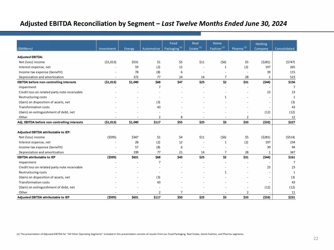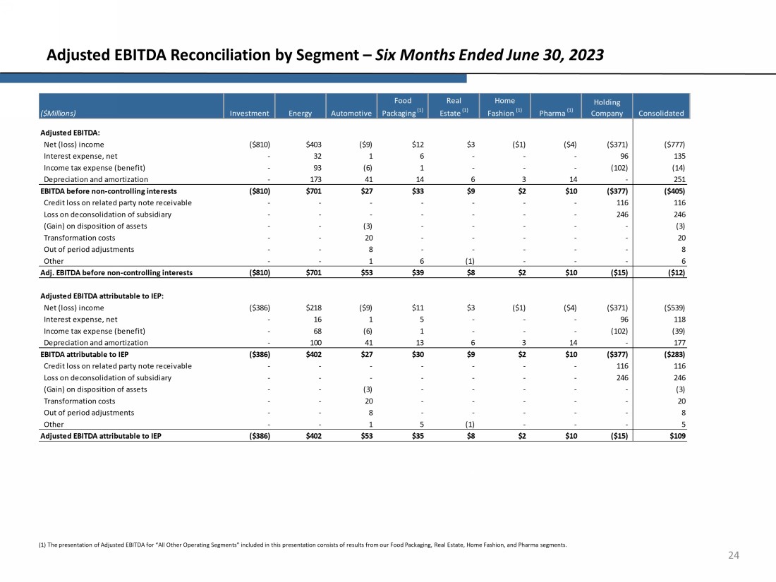 23 Adjusted EBITDA Reconciliation by Segment – Six Months Ended June 30, 2024 (1) The presentation of Adjusted EBITDA for “All Other Operating Segments” included in this presentation consists of results fro m our Food Packaging, Real Estate, Home Fashion, and Pharma segments. Net (loss) income ($470) $103 ($2) $4 ($2) ($1) $4 ($148) ($512) Interest expense, net - 39 (1) 6 - - (1) 104 147 Income tax expense (benefit) - (18) (4) 3 - - - 30 11 Depreciation and amortization - 182 37 13 7 3 14 - 256 ($470) $306 $30 $26 $5 $2 $17 ($14) ($98) Loss on disposition of assets, net - - 4 - - - - - 4 Transformation costs - - 22 - - - - - 22 Loss on extinguishment of debt, net - - - - - - - 1 1 Out of period adjustments - - (2) - - - - - (2) Other - - 3 3 - - 1 - 7 ($470) $306 $57 $29 $5 $2 $18 ($13) ($66) Net (loss) income ($280) $57 ($2) $3 ($2) ($1) $4 ($148) ($369) Interest expense, net - 20 (1) 6 - - (1) 104 128 Income tax expense (benefit) - (10) (4) 3 - - - 30 19 Depreciation and amortization - 97 37 12 7 3 14 - 170 ($280) $164 $30 $24 $5 $2 $17 ($14) ($52) Loss on disposition of assets, net - - 4 - - - - - 4 Transformation costs - - 22 - - - - - 22 Loss on extinguishment of debt, net - - - - - - - 1 1 Out of period adjustments - - (2) - - - - - (2) Other - - 3 2 - - 1 - 6 ($280) $164 $57 $26 $5 $2 $18 ($13) ($21) EBITDA before non-controlling interests Adj. EBITDA before non-controlling interests Adjusted EBITDA attributable to IEP Adjusted EBITDA attributable to IEP: EBITDA attributable to IEP Adjusted EBITDA: ($Millions) Investment Energy Automotive Food Packaging (1) Holding Company Consolidated Real Estate (1) Home Fashion (1) Pharma (1)