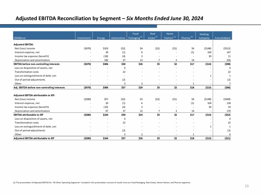 22 Adjusted EBITDA Reconciliation by Segment – Last Twelve Months Ended June 30, 2024 (1) The presentation of Adjusted EBITDA for “All Other Operating Segments” included in this presentation consists of results fro m our Food Packaging, Real Estate, Home Fashion, and Pharma segments. Net (loss) income ($1,013) $531 $1 $5 $11 ($6) $5 ($281) ($747) Interest expense, net - 59 (2) 12 - 1 (2) 197 265 Income tax expense (benefit) - 78 (8) 6 - - - 39 115 Depreciation and amortization - 372 77 24 14 7 28 1 523 ($1,013) $1,040 $68 $47 $25 $2 $31 ($44) $156 Impairment - - 7 - - - - - 7 Credit loss on related party note receivable - - - - - - - 23 23 Restructuring costs - - - - - 1 - - 1 (Gain) on disposition of assets, net - - (3) - - - - - (3) Transformation costs - - 43 - - - - - 43 (Gain) on extinguishment of debt, net - - - - - - - (12) (12) Other - - 2 8 - - 2 - 12 ($1,013) $1,040 $117 $55 $25 $3 $33 ($33) $227 Net (loss) income ($595) $347 $1 $4 $11 ($6) $5 ($281) ($514) Interest expense, net - 28 (2) 12 - 1 (2) 197 234 Income tax expense (benefit) - 57 (8) 6 - - - 39 94 Depreciation and amortization - 199 77 21 14 7 28 1 347 ($595) $631 $68 $43 $25 $2 $31 ($44) $161 Impairment - - 7 - - - - - 7 Credit loss on related party note receivable - - - - - - - 23 23 Restructuring costs - - - - - 1 - - 1 (Gain) on disposition of assets, net - - (3) - - - - - (3) Transformation costs - - 43 - - - - - 43 (Gain) on extinguishment of debt, net - - - - - - - (12) (12) Other - - 2 7 - - 2 - 11 ($595) $631 $117 $50 $25 $3 $33 ($33) $231 Holding Company Consolidated Adjusted EBITDA attributable to IEP Adjusted EBITDA: EBITDA before non-controlling interests Adj. EBITDA before non-controlling interests Adjusted EBITDA attributable to IEP: EBITDA attributable to IEP Real Estate (1) Home Fashion (1) Pharma (1) ($Millions) Investment Energy Automotive Food Packaging (1)