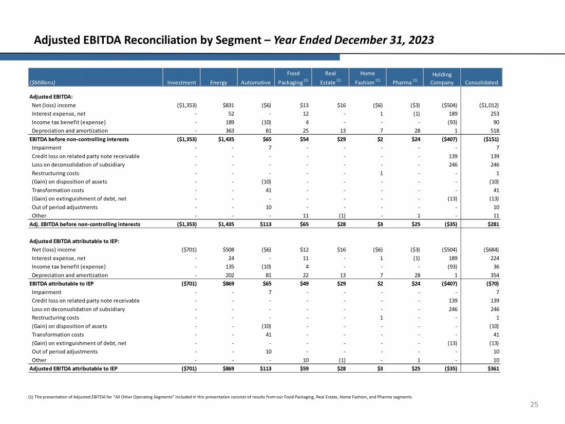 24 Adjusted EBITDA Reconciliation by Segment – Six Months Ended June 30, 2023 (1) The presentation of Adjusted EBITDA for “All Other Operating Segments” included in this presentation consists of results fro m our Food Packaging, Real Estate, Home Fashion, and Pharma segments. Net (loss) income ($810) $403 ($9) $12 $3 ($1) ($4) ($371) ($777) Interest expense, net - 32 1 6 - - - 96 135 Income tax expense (benefit) - 93 (6) 1 - - - (102) (14) Depreciation and amortization - 173 41 14 6 3 14 - 251 ($810) $701 $27 $33 $9 $2 $10 ($377) ($405) Credit loss on related party note receivable - - - - - - - 116 116 Loss on deconsolidation of subsidiary - - - - - - - 246 246 (Gain) on disposition of assets - - (3) - - - - - (3) Transformation costs - - 20 - - - - - 20 Out of period adjustments - - 8 - - - - - 8 Other - - 1 6 (1) - - - 6 ($810) $701 $53 $39 $8 $2 $10 ($15) ($12) Net (loss) income ($386) $218 ($9) $11 $3 ($1) ($4) ($371) ($539) Interest expense, net - 16 1 5 - - - 96 118 Income tax expense (benefit) - 68 (6) 1 - - - (102) (39) Depreciation and amortization - 100 41 13 6 3 14 - 177 ($386) $402 $27 $30 $9 $2 $10 ($377) ($283) Credit loss on related party note receivable - - - - - - - 116 116 Loss on deconsolidation of subsidiary - - - - - - - 246 246 (Gain) on disposition of assets - - (3) - - - - - (3) Transformation costs - - 20 - - - - - 20 Out of period adjustments - - 8 - - - - - 8 Other - - 1 5 (1) - - - 5 ($386) $402 $53 $35 $8 $2 $10 ($15) $109 EBITDA before non-controlling interests Adj. EBITDA before non-controlling interests Adjusted EBITDA attributable to IEP Adjusted EBITDA attributable to IEP: EBITDA attributable to IEP Adjusted EBITDA: ($Millions) Investment Energy Automotive Food Packaging (1) Holding Company Consolidated Real Estate (1) Home Fashion (1) Pharma (1)
