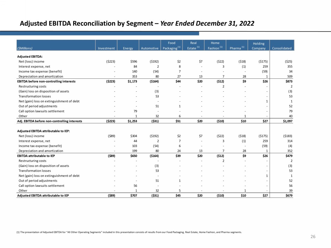 25 Adjusted EBITDA Reconciliation by Segment – Year Ended December 31, 2023 (1) The presentation of Adjusted EBITDA for “All Other Operating Segments” included in this presentation consists of results fro m our Food Packaging, Real Estate, Home Fashion, and Pharma segments. Net (loss) income ($1,353) $831 ($6) $13 $16 ($6) ($3) ($504) ($1,012) Interest expense, net - 52 - 12 - 1 (1) 189 253 Income tax benefit (expense) - 189 (10) 4 - - - (93) 90 Depreciation and amortization - 363 81 25 13 7 28 1 518 ($1,353) $1,435 $65 $54 $29 $2 $24 ($407) ($151) Impairment - - 7 - - - - - 7 Credit loss on related party note receivable - - - - - - - 139 139 Loss on deconsolidation of subsidiary - - - - - - - 246 246 Restructuring costs - - - - - 1 - - 1 (Gain) on disposition of assets - - (10) - - - - - (10) Transformation costs - - 41 - - - - - 41 (Gain) on extinguishment of debt, net - - - - - - - (13) (13) Out of period adjustments - - 10 - - - - - 10 Other - - - 11 (1) - 1 - 11 ($1,353) $1,435 $113 $65 $28 $3 $25 ($35) $281 Net (loss) income ($701) $508 ($6) $12 $16 ($6) ($3) ($504) ($684) Interest expense, net - 24 - 11 - 1 (1) 189 224 Income tax benefit (expense) - 135 (10) 4 - - - (93) 36 Depreciation and amortization - 202 81 22 13 7 28 1 354 ($701) $869 $65 $49 $29 $2 $24 ($407) ($70) Impairment - - 7 - - - - - 7 Credit loss on related party note receivable - - - - - - - 139 139 Loss on deconsolidation of subsidiary - - - - - - - 246 246 Restructuring costs - - - - - 1 - - 1 (Gain) on disposition of assets - - (10) - - - - - (10) Transformation costs - - 41 - - - - - 41 (Gain) on extinguishment of debt, net - - - - - - - (13) (13) Out of period adjustments - - 10 - - - - - 10 Other - - - 10 (1) - 1 - 10 ($701) $869 $113 $59 $28 $3 $25 ($35) $361 Real Estate (1) ($Millions) Investment Energy Automotive Food Packaging (1) Holding Company Consolidated Home Fashion (1) Pharma (1) Adjusted EBITDA: EBITDA before non-controlling interests Adj. EBITDA before non-controlling interests Adjusted EBITDA attributable to IEP: EBITDA attributable to IEP Adjusted EBITDA attributable to IEP