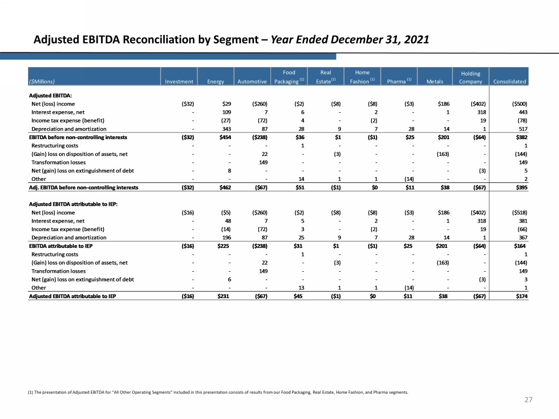 26 Adjusted EBITDA Reconciliation by Segment – Year Ended December 31, 2022 (1) The presentation of Adjusted EBITDA for “All Other Operating Segments” included in this presentation consists of results fro m our Food Packaging, Real Estate, Home Fashion, and Pharma segments. Net (loss) income ($223) $596 ($192) $2 $7 ($22) ($18) ($175) ($25) Interest expense, net - 84 2 8 - 3 (1) 259 355 Income tax expense (benefit) - 140 (54) 7 - - - (59) 34 Depreciation and amortization - 353 80 27 13 7 28 1 509 ($223) $1,173 ($164) $44 $20 ($12) $9 $26 $873 Restructuring costs - - - - - 2 - - 2 (Gain) loss on disposition of assets - - (3) - - - - - (3) Transformation losses - - 53 - - - - - 53 Net (gain) loss on extinguishment of debt - - - - - - - 1 1 Out of period adjustments - - 51 1 - - - - 52 Call option lawsuits settlement - 79 - - - - - - 79 Other - 1 32 6 - - 1 - 40 ($223) $1,253 ($31) $51 $20 ($10) $10 $27 $1,097 Net (loss) income ($89) $304 ($192) $2 $7 ($22) ($18) ($175) ($183) Interest expense, net - 44 2 7 - 3 (1) 259 314 Income tax expense (benefit) - 103 (54) 6 - - - (59) (4) Depreciation and amortization - 199 80 24 13 7 28 1 352 ($89) $650 ($164) $39 $20 ($12) $9 $26 $479 Restructuring costs - - - - - 2 - - 2 (Gain) loss on disposition of assets - - (3) - - - - - (3) Transformation losses - - 53 - - - - - 53 Net (gain) loss on extinguishment of debt - - - - - - - 1 1 Out of period adjustments - - 51 1 - - - - 52 Call option lawsuits settlement - 56 - - - - - - 56 Other - 1 32 5 - - 1 - 39 ($89) $707 ($31) $45 $20 ($10) $10 $27 $679 Home Fashion (1) Pharma (1) Investment Energy Automotive Food Packaging (1) Real Estate (1) ($Millions) Holding Company Consolidated Adjusted EBITDA: EBITDA before non-controlling interests Adjusted EBITDA attributable to IEP: Adj. EBITDA before non-controlling interests EBITDA attributable to IEP Adjusted EBITDA attributable to IEP