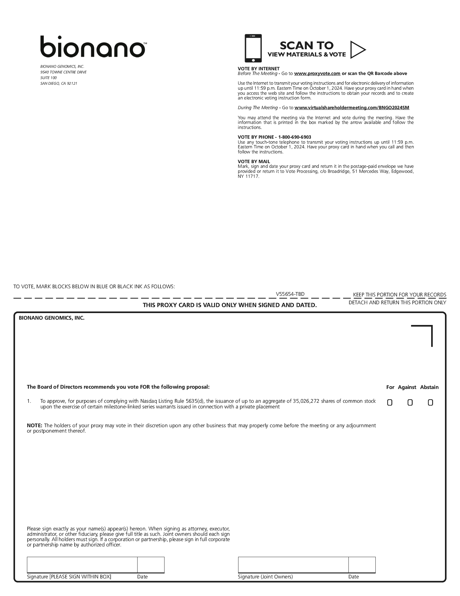 Bionano will pay for the entire cost of soliciting proxies. In addition to these proxy materials, our directors and employees may also solicit proxies in person, by telephone, or by other means of communication. Directors and employees will not be paid any additional compensation for soliciting proxies. We may also reimburse brokerage firms, banks, dealers and other agents for the cost of forwarding proxy materials to beneficial owners. In addition, we have engaged Sodali & Co. to assist in the solicitation of proxies and provide related advice and informational support, for a services fee and the reimbursement of customary disbursements, which are not expected to exceed $20,000 in total. If you have any questions regarding this proxy statement, you may contact Sodali & Co. at (203) 561-6945.