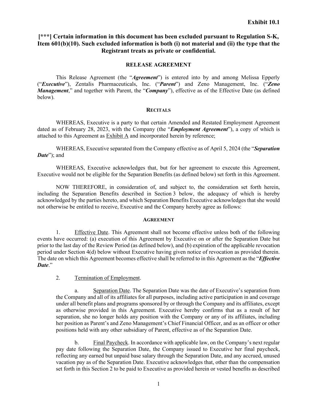 Exhibit 10.1 [***] Certain information in this document has been excluded pursuant to Regulation S-K, Item 601(b)(10). Such excluded information is both (i) not material and (ii) the type that the Registrant treats as private or confidential. 1 RELEASE AGREEMENT This Release Agreement (the “Agreement”) is entered into by and among Melissa Epperly (“Executive”), Zentalis Pharmaceuticals, Inc. (“Parent”) and Zeno Management, Inc. (“Zeno Management,” and together with Parent, the “Company”), effective as of the Effective Date (as defined below). RECITALS WHEREAS, Executive is a party to that certain Amended and Restated Employment Agreement dated as of February 28, 2023, with the Company (the “Employment Agreement”), a copy of which is attached to this Agreement as Exhibit A and incorporated herein by reference; WHEREAS, Executive separated from the Company effective as of April 5, 2024 (the “Separation Date”); and WHEREAS, Executive acknowledges that, but for her agreement to execute this Agreement, Executive would not be eligible for the Separation Benefits (as defined below) set forth in this Agreement. NOW THEREFORE, in consideration of, and subject to, the consideration set forth herein, including the Separation Benefits described in Section 3 below, the adequacy of which is hereby acknowledged by the parties hereto, and which Separation Benefits Executive acknowledges that she would not otherwise be entitled to receive, Executive and the Company hereby agree as follows: AGREEMENT 1. Effective Date. This Agreement shall not become effective unless both of the following events have occurred: (a) execution of this Agreement by Executive on or after the Separation Date but prior to the last day of the Review Period (as defined below), and (b) expiration of the applicable revocation period under Section 4(d) below without Executive having given notice of revocation as provided therein. The date on which this Agreement becomes effective shall be referred to in this Agreement as the “Effective Date.” 2. Termination of Employment. a. Separation Date. The Separation Date was the date of Executive’s separation from the Company and all of its affiliates for all purposes, including active participation in and coverage under all benefit plans and programs sponsored by or through the Company and its affiliates, except as otherwise provided in this Agreement. Executive hereby confirms that as a result of her separation, she no longer holds any position with the Company or any of its affiliates, including her position as Parent’s and Zeno Management’s Chief Financial Officer, and as an officer or other positions held with any other subsidiary of Parent, effective as of the Separation Date. b. Final Paycheck. In accordance with applicable law, on the Company’s next regular pay date following the Separation Date, the Company issued to Executive her final paycheck, reflecting any earned but unpaid base salary through the Separation Date, and any accrued, unused vacation pay as of the Separation Date. Executive acknowledges that, other than the compensation set forth in this Section 2 to be paid to Executive as provided herein or vested benefits as described