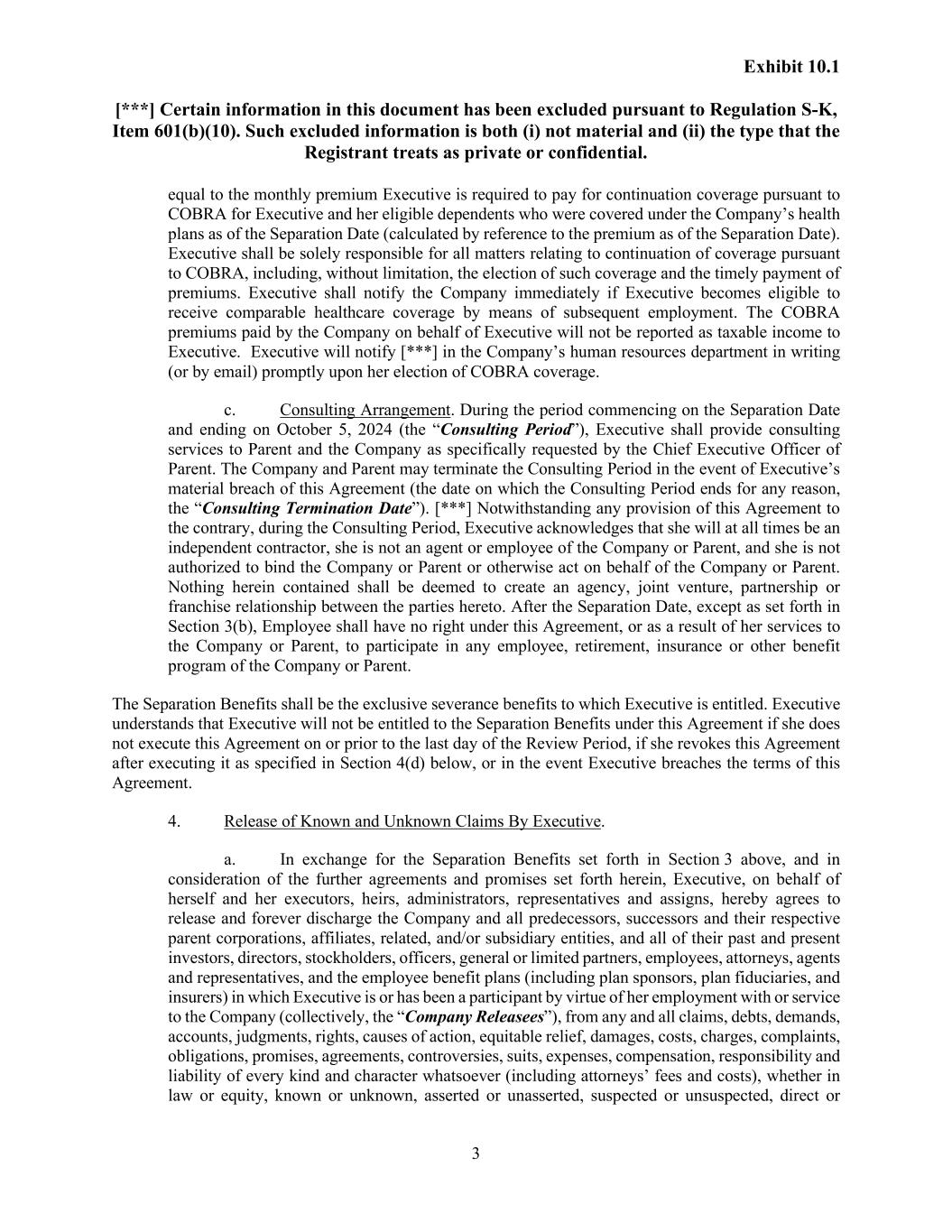 Exhibit 10.1 [***] Certain information in this document has been excluded pursuant to Regulation S-K, Item 601(b)(10). Such excluded information is both (i) not material and (ii) the type that the Registrant treats as private or confidential. 3 equal to the monthly premium Executive is required to pay for continuation coverage pursuant to COBRA for Executive and her eligible dependents who were covered under the Company’s health plans as of the Separation Date (calculated by reference to the premium as of the Separation Date). Executive shall be solely responsible for all matters relating to continuation of coverage pursuant to COBRA, including, without limitation, the election of such coverage and the timely payment of premiums. Executive shall notify the Company immediately if Executive becomes eligible to receive comparable healthcare coverage by means of subsequent employment. The COBRA premiums paid by the Company on behalf of Executive will not be reported as taxable income to Executive. Executive will notify [***] in the Company’s human resources department in writing (or by email) promptly upon her election of COBRA coverage. c. Consulting Arrangement. During the period commencing on the Separation Date and ending on October 5, 2024 (the “Consulting Period”), Executive shall provide consulting services to Parent and the Company as specifically requested by the Chief Executive Officer of Parent. The Company and Parent may terminate the Consulting Period in the event of Executive’s material breach of this Agreement (the date on which the Consulting Period ends for any reason, the “Consulting Termination Date”). [***] Notwithstanding any provision of this Agreement to the contrary, during the Consulting Period, Executive acknowledges that she will at all times be an independent contractor, she is not an agent or employee of the Company or Parent, and she is not authorized to bind the Company or Parent or otherwise act on behalf of the Company or Parent. Nothing herein contained shall be deemed to create an agency, joint venture, partnership or franchise relationship between the parties hereto. After the Separation Date, except as set forth in Section 3(b), Employee shall have no right under this Agreement, or as a result of her services to the Company or Parent, to participate in any employee, retirement, insurance or other benefit program of the Company or Parent. The Separation Benefits shall be the exclusive severance benefits to which Executive is entitled. Executive understands that Executive will not be entitled to the Separation Benefits under this Agreement if she does not execute this Agreement on or prior to the last day of the Review Period, if she revokes this Agreement after executing it as specified in Section 4(d) below, or in the event Executive breaches the terms of this Agreement. 4. Release of Known and Unknown Claims By Executive. a. In exchange for the Separation Benefits set forth in Section 3 above, and in consideration of the further agreements and promises set forth herein, Executive, on behalf of herself and her executors, heirs, administrators, representatives and assigns, hereby agrees to release and forever discharge the Company and all predecessors, successors and their respective parent corporations, affiliates, related, and/or subsidiary entities, and all of their past and present investors, directors, stockholders, officers, general or limited partners, employees, attorneys, agents and representatives, and the employee benefit plans (including plan sponsors, plan fiduciaries, and insurers) in which Executive is or has been a participant by virtue of her employment with or service to the Company (collectively, the “Company Releasees”), from any and all claims, debts, demands, accounts, judgments, rights, causes of action, equitable relief, damages, costs, charges, complaints, obligations, promises, agreements, controversies, suits, expenses, compensation, responsibility and liability of every kind and character whatsoever (including attorneys’ fees and costs), whether in law or equity, known or unknown, asserted or unasserted, suspected or unsuspected, direct or