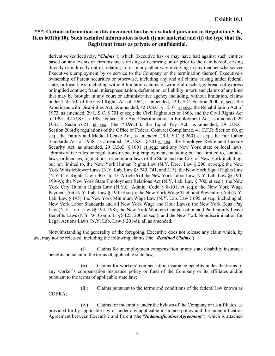 Exhibit 10.1 [***] Certain information in this document has been excluded pursuant to Regulation S-K, Item 601(b)(10). Such excluded information is both (i) not material and (ii) the type that the Registrant treats as private or confidential. 4 derivative (collectively, “Claims”), which Executive has or may have had against such entities based on any events or circumstances arising or occurring on or prior to the date hereof, arising directly or indirectly out of, relating to, or in any other way involving in any manner whatsoever Executive’s employment by or service to the Company or the termination thereof, Executive’s ownership of Parent securities or otherwise, including any and all claims arising under federal, state, or local laws, including without limitation claims of wrongful discharge, breach of express or implied contract, fraud, misrepresentation, defamation, or liability in tort, and claims of any kind that may be brought in any court or administrative agency including, without limitation, claims under Title VII of the Civil Rights Act of 1964, as amended, 42 U.S.C. Section 2000, et seq.; the Americans with Disabilities Act, as amended, 42 U.S.C. § 12101 et seq.; the Rehabilitation Act of 1973, as amended, 29 U.S.C. § 701 et seq.; the Civil Rights Act of 1866, and the Civil Rights Act of 1991; 42 U.S.C. § 1981, et seq.; the Age Discrimination in Employment Act, as amended, 29 U.S.C. Section 621, et seq. (the “ADEA”); the Equal Pay Act, as amended, 29 U.S.C. Section 206(d); regulations of the Office of Federal Contract Compliance, 41 C.F.R. Section 60, et seq.; the Family and Medical Leave Act, as amended, 29 U.S.C. § 2601 et seq.; the Fair Labor Standards Act of 1938, as amended, 29 U.S.C. § 201 et seq.; the Employee Retirement Income Security Act, as amended, 29 U.S.C. § 1001 et seq.; and any New York state or local laws, administrative rules or regulations respecting employment, including but not limited to, statutes, laws, ordinances, regulations, or common laws of the State and the City of New York including, but not limited to, the New York Human Rights Law (N.Y. Exec. Law § 290, et seq.); the New York Whistleblower Laws (N.Y. Lab. Law §§ 740, 741, and 215); the New York Equal Rights Law (N.Y. Civ. Rights Law § 40-C to 45, Article 6 of the New York Labor Law, N.Y. Lab. Law §§ 190- 199-A); the New York State Employment Relations Act (N.Y. Lab. Law § 700, et seq.); the New York City Human Rights Law (N.Y.C. Admin. Code § 8-101, et seq.); the New York Wage Payment Act (N.Y. Lab. Law § 190, et seq.); the New York Wage Theft and Prevention Act (N.Y. Lab. Law § 195); the New York Minimum Wage Law (N.Y. Lab. Law § 695, et seq., including all New York Labor Standards and all New York Wage and Hour Laws); the New York Equal Pay Law (N.Y. Lab. Law §§ 194, 198); the New York Workers Compensation and Paid Family Leave Benefits Laws (N.Y. W. Comp. L. §§ 125, 200, et seq.); and the New York Nondiscrimination for Legal Actions Laws (N.Y. Lab. Law § 201-d), all as amended. Notwithstanding the generality of the foregoing, Executive does not release any claim which, by law, may not be released, including the following claims (the “Retained Claims”): (i) Claims for unemployment compensation or any state disability insurance benefits pursuant to the terms of applicable state law; (ii) Claims for workers’ compensation insurance benefits under the terms of any worker’s compensation insurance policy or fund of the Company or its affiliates and/or pursuant to the terms of applicable state law; (iii) Claims pursuant to the terms and conditions of the federal law known as COBRA; (iv) Claims for indemnity under the bylaws of the Company or its affiliates, as provided for by applicable law or under any applicable insurance policy and the Indemnification Agreement between Executive and Parent (the “Indemnification Agreement”), which is attached