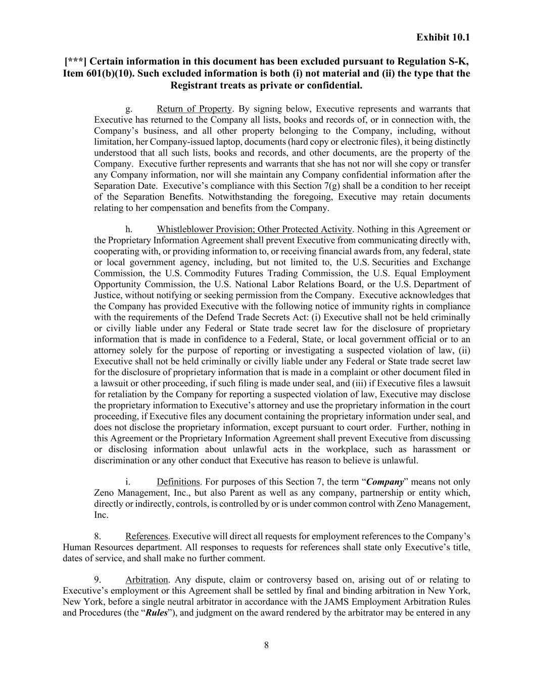 Exhibit 10.1 [***] Certain information in this document has been excluded pursuant to Regulation S-K, Item 601(b)(10). Such excluded information is both (i) not material and (ii) the type that the Registrant treats as private or confidential. 8 g. Return of Property. By signing below, Executive represents and warrants that Executive has returned to the Company all lists, books and records of, or in connection with, the Company’s business, and all other property belonging to the Company, including, without limitation, her Company-issued laptop, documents (hard copy or electronic files), it being distinctly understood that all such lists, books and records, and other documents, are the property of the Company. Executive further represents and warrants that she has not nor will she copy or transfer any Company information, nor will she maintain any Company confidential information after the Separation Date. Executive’s compliance with this Section 7(g) shall be a condition to her receipt of the Separation Benefits. Notwithstanding the foregoing, Executive may retain documents relating to her compensation and benefits from the Company. h. Whistleblower Provision; Other Protected Activity. Nothing in this Agreement or the Proprietary Information Agreement shall prevent Executive from communicating directly with, cooperating with, or providing information to, or receiving financial awards from, any federal, state or local government agency, including, but not limited to, the U.S. Securities and Exchange Commission, the U.S. Commodity Futures Trading Commission, the U.S. Equal Employment Opportunity Commission, the U.S. National Labor Relations Board, or the U.S. Department of Justice, without notifying or seeking permission from the Company. Executive acknowledges that the Company has provided Executive with the following notice of immunity rights in compliance with the requirements of the Defend Trade Secrets Act: (i) Executive shall not be held criminally or civilly liable under any Federal or State trade secret law for the disclosure of proprietary information that is made in confidence to a Federal, State, or local government official or to an attorney solely for the purpose of reporting or investigating a suspected violation of law, (ii) Executive shall not be held criminally or civilly liable under any Federal or State trade secret law for the disclosure of proprietary information that is made in a complaint or other document filed in a lawsuit or other proceeding, if such filing is made under seal, and (iii) if Executive files a lawsuit for retaliation by the Company for reporting a suspected violation of law, Executive may disclose the proprietary information to Executive’s attorney and use the proprietary information in the court proceeding, if Executive files any document containing the proprietary information under seal, and does not disclose the proprietary information, except pursuant to court order. Further, nothing in this Agreement or the Proprietary Information Agreement shall prevent Executive from discussing or disclosing information about unlawful acts in the workplace, such as harassment or discrimination or any other conduct that Executive has reason to believe is unlawful. i. Definitions. For purposes of this Section 7, the term “Company” means not only Zeno Management, Inc., but also Parent as well as any company, partnership or entity which, directly or indirectly, controls, is controlled by or is under common control with Zeno Management, Inc. 8. References. Executive will direct all requests for employment references to the Company’s Human Resources department. All responses to requests for references shall state only Executive’s title, dates of service, and shall make no further comment. 9. Arbitration. Any dispute, claim or controversy based on, arising out of or relating to Executive’s employment or this Agreement shall be settled by final and binding arbitration in New York, New York, before a single neutral arbitrator in accordance with the JAMS Employment Arbitration Rules and Procedures (the “Rules”), and judgment on the award rendered by the arbitrator may be entered in any