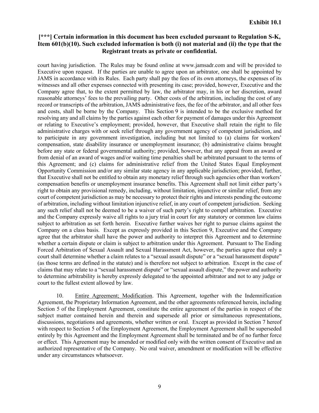 Exhibit 10.1 [***] Certain information in this document has been excluded pursuant to Regulation S-K, Item 601(b)(10). Such excluded information is both (i) not material and (ii) the type that the Registrant treats as private or confidential. 9 court having jurisdiction. The Rules may be found online at www.jamsadr.com and will be provided to Executive upon request. If the parties are unable to agree upon an arbitrator, one shall be appointed by JAMS in accordance with its Rules. Each party shall pay the fees of its own attorneys, the expenses of its witnesses and all other expenses connected with presenting its case; provided, however, Executive and the Company agree that, to the extent permitted by law, the arbitrator may, in his or her discretion, award reasonable attorneys’ fees to the prevailing party. Other costs of the arbitration, including the cost of any record or transcripts of the arbitration, JAMS administrative fees, the fee of the arbitrator, and all other fees and costs, shall be borne by the Company. This Section 9 is intended to be the exclusive method for resolving any and all claims by the parties against each other for payment of damages under this Agreement or relating to Executive’s employment; provided, however, that Executive shall retain the right to file administrative charges with or seek relief through any government agency of competent jurisdiction, and to participate in any government investigation, including but not limited to (a) claims for workers’ compensation, state disability insurance or unemployment insurance; (b) administrative claims brought before any state or federal governmental authority; provided, however, that any appeal from an award or from denial of an award of wages and/or waiting time penalties shall be arbitrated pursuant to the terms of this Agreement; and (c) claims for administrative relief from the United States Equal Employment Opportunity Commission and/or any similar state agency in any applicable jurisdiction; provided, further, that Executive shall not be entitled to obtain any monetary relief through such agencies other than workers’ compensation benefits or unemployment insurance benefits. This Agreement shall not limit either party’s right to obtain any provisional remedy, including, without limitation, injunctive or similar relief, from any court of competent jurisdiction as may be necessary to protect their rights and interests pending the outcome of arbitration, including without limitation injunctive relief, in any court of competent jurisdiction. Seeking any such relief shall not be deemed to be a waiver of such party’s right to compel arbitration. Executive and the Company expressly waive all rights to a jury trial in court for any statutory or common law claims subject to arbitration as set forth herein. Executive further waives her right to pursue claims against the Company on a class basis. Except as expressly provided in this Section 9, Executive and the Company agree that the arbitrator shall have the power and authority to interpret this Agreement and to determine whether a certain dispute or claim is subject to arbitration under this Agreement. Pursuant to The Ending Forced Arbitration of Sexual Assault and Sexual Harassment Act, however, the parties agree that only a court shall determine whether a claim relates to a “sexual assault dispute” or a “sexual harassment dispute” (as those terms are defined in the statute) and is therefore not subject to arbitration. Except in the case of claims that may relate to a “sexual harassment dispute” or “sexual assault dispute,” the power and authority to determine arbitrability is hereby expressly delegated to the appointed arbitrator and not to any judge or court to the fullest extent allowed by law. 10. Entire Agreement; Modification. This Agreement, together with the Indemnification Agreement, the Proprietary Information Agreement, and the other agreements referenced herein, including Section 5 of the Employment Agreement, constitute the entire agreement of the parties in respect of the subject matter contained herein and therein and supersede all prior or simultaneous representations, discussions, negotiations and agreements, whether written or oral. Except as provided in Section 7 hereof with respect to Section 5 of the Employment Agreement, the Employment Agreement shall be superseded entirely by this Agreement and the Employment Agreement shall be terminated and be of no further force or effect. This Agreement may be amended or modified only with the written consent of Executive and an authorized representative of the Company. No oral waiver, amendment or modification will be effective under any circumstances whatsoever.