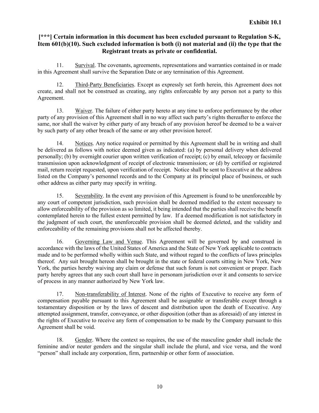 Exhibit 10.1 [***] Certain information in this document has been excluded pursuant to Regulation S-K, Item 601(b)(10). Such excluded information is both (i) not material and (ii) the type that the Registrant treats as private or confidential. 10 11. Survival. The covenants, agreements, representations and warranties contained in or made in this Agreement shall survive the Separation Date or any termination of this Agreement. 12. Third-Party Beneficiaries. Except as expressly set forth herein, this Agreement does not create, and shall not be construed as creating, any rights enforceable by any person not a party to this Agreement. 13. Waiver. The failure of either party hereto at any time to enforce performance by the other party of any provision of this Agreement shall in no way affect such party’s rights thereafter to enforce the same, nor shall the waiver by either party of any breach of any provision hereof be deemed to be a waiver by such party of any other breach of the same or any other provision hereof. 14. Notices. Any notice required or permitted by this Agreement shall be in writing and shall be delivered as follows with notice deemed given as indicated: (a) by personal delivery when delivered personally; (b) by overnight courier upon written verification of receipt; (c) by email, telecopy or facsimile transmission upon acknowledgment of receipt of electronic transmission; or (d) by certified or registered mail, return receipt requested, upon verification of receipt. Notice shall be sent to Executive at the address listed on the Company’s personnel records and to the Company at its principal place of business, or such other address as either party may specify in writing. 15. Severability. In the event any provision of this Agreement is found to be unenforceable by any court of competent jurisdiction, such provision shall be deemed modified to the extent necessary to allow enforceability of the provision as so limited, it being intended that the parties shall receive the benefit contemplated herein to the fullest extent permitted by law. If a deemed modification is not satisfactory in the judgment of such court, the unenforceable provision shall be deemed deleted, and the validity and enforceability of the remaining provisions shall not be affected thereby. 16. Governing Law and Venue. This Agreement will be governed by and construed in accordance with the laws of the United States of America and the State of New York applicable to contracts made and to be performed wholly within such State, and without regard to the conflicts of laws principles thereof. Any suit brought hereon shall be brought in the state or federal courts sitting in New York, New York, the parties hereby waiving any claim or defense that such forum is not convenient or proper. Each party hereby agrees that any such court shall have in personam jurisdiction over it and consents to service of process in any manner authorized by New York law. 17. Non-transferability of Interest. None of the rights of Executive to receive any form of compensation payable pursuant to this Agreement shall be assignable or transferable except through a testamentary disposition or by the laws of descent and distribution upon the death of Executive. Any attempted assignment, transfer, conveyance, or other disposition (other than as aforesaid) of any interest in the rights of Executive to receive any form of compensation to be made by the Company pursuant to this Agreement shall be void. 18. Gender. Where the context so requires, the use of the masculine gender shall include the feminine and/or neuter genders and the singular shall include the plural, and vice versa, and the word “person” shall include any corporation, firm, partnership or other form of association.