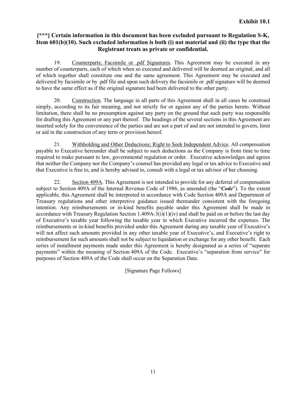 Exhibit 10.1 [***] Certain information in this document has been excluded pursuant to Regulation S-K, Item 601(b)(10). Such excluded information is both (i) not material and (ii) the type that the Registrant treats as private or confidential. 11 19. Counterparts; Facsimile or .pdf Signatures. This Agreement may be executed in any number of counterparts, each of which when so executed and delivered will be deemed an original, and all of which together shall constitute one and the same agreement. This Agreement may be executed and delivered by facsimile or by .pdf file and upon such delivery the facsimile or .pdf signature will be deemed to have the same effect as if the original signature had been delivered to the other party. 20. Construction. The language in all parts of this Agreement shall in all cases be construed simply, according to its fair meaning, and not strictly for or against any of the parties hereto. Without limitation, there shall be no presumption against any party on the ground that such party was responsible for drafting this Agreement or any part thereof. The headings of the several sections in this Agreement are inserted solely for the convenience of the parties and are not a part of and are not intended to govern, limit or aid in the construction of any term or provision hereof. 21. Withholding and Other Deductions; Right to Seek Independent Advice. All compensation payable to Executive hereunder shall be subject to such deductions as the Company is from time to time required to make pursuant to law, governmental regulation or order. Executive acknowledges and agrees that neither the Company nor the Company’s counsel has provided any legal or tax advice to Executive and that Executive is free to, and is hereby advised to, consult with a legal or tax advisor of her choosing. 22. Section 409A. This Agreement is not intended to provide for any deferral of compensation subject to Section 409A of the Internal Revenue Code of 1986, as amended (the “Code”). To the extent applicable, this Agreement shall be interpreted in accordance with Code Section 409A and Department of Treasury regulations and other interpretive guidance issued thereunder consistent with the foregoing intention. Any reimbursements or in-kind benefits payable under this Agreement shall be made in accordance with Treasury Regulation Section 1.409A-3(i)(1)(iv) and shall be paid on or before the last day of Executive’s taxable year following the taxable year in which Executive incurred the expenses. The reimbursements or in-kind benefits provided under this Agreement during any taxable year of Executive’s will not affect such amounts provided in any other taxable year of Executive’s, and Executive’s right to reimbursement for such amounts shall not be subject to liquidation or exchange for any other benefit. Each series of installment payments made under this Agreement is hereby designated as a series of “separate payments” within the meaning of Section 409A of the Code. Executive’s “separation from service” for purposes of Section 409A of the Code shall occur on the Separation Date. [Signature Page Follows]