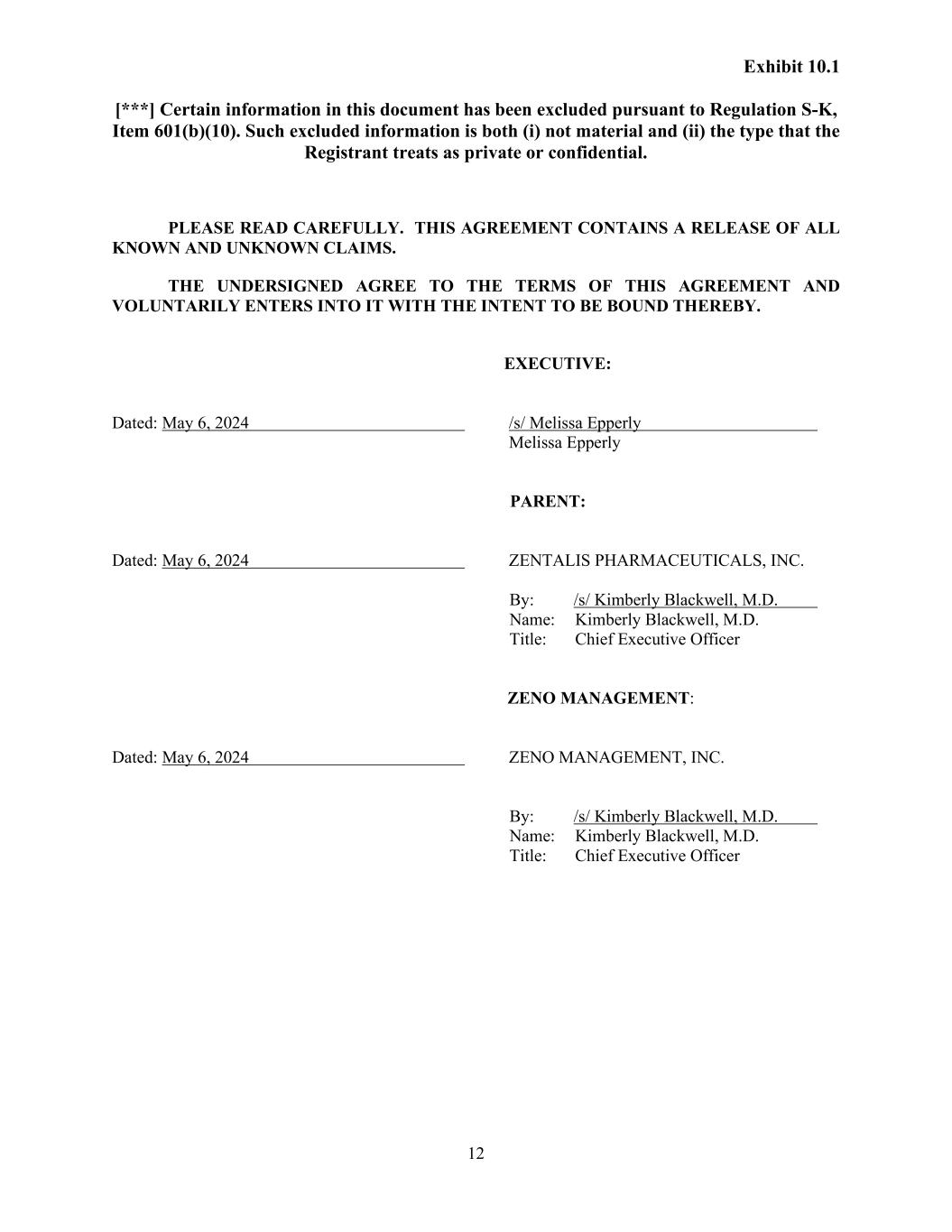 Exhibit 10.1 [***] Certain information in this document has been excluded pursuant to Regulation S-K, Item 601(b)(10). Such excluded information is both (i) not material and (ii) the type that the Registrant treats as private or confidential. 12 PLEASE READ CAREFULLY. THIS AGREEMENT CONTAINS A RELEASE OF ALL KNOWN AND UNKNOWN CLAIMS. THE UNDERSIGNED AGREE TO THE TERMS OF THIS AGREEMENT AND VOLUNTARILY ENTERS INTO IT WITH THE INTENT TO BE BOUND THEREBY. EXECUTIVE: Dated: May 6, 2024 /s/ Melissa Epperly Melissa Epperly PARENT: Dated: May 6, 2024 ZENTALIS PHARMACEUTICALS, INC. By: /s/ Kimberly Blackwell, M.D. Name: Kimberly Blackwell, M.D. Title: Chief Executive Officer ZENO MANAGEMENT: Dated: May 6, 2024 ZENO MANAGEMENT, INC. By: /s/ Kimberly Blackwell, M.D. Name: Kimberly Blackwell, M.D. Title: Chief Executive Officer