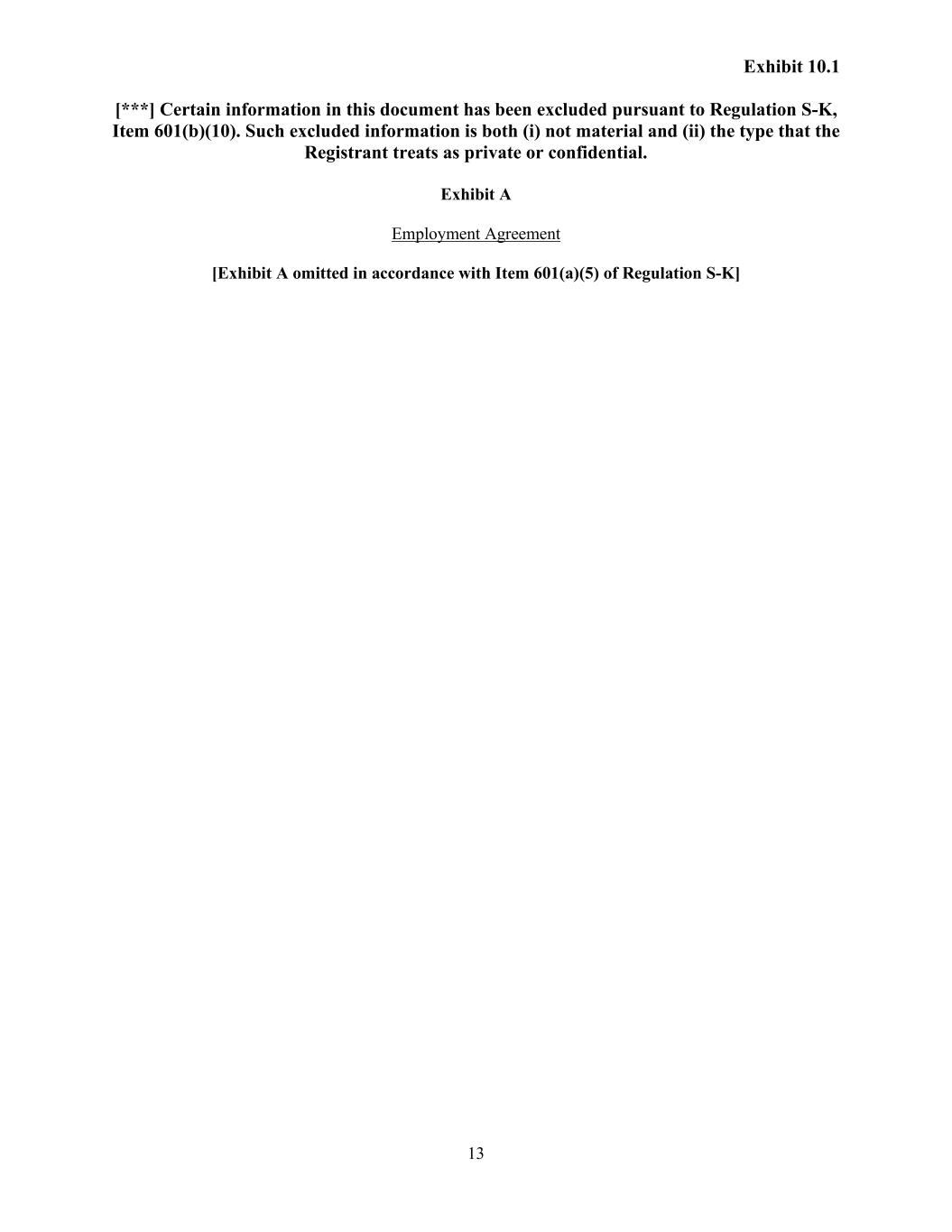 Exhibit 10.1 [***] Certain information in this document has been excluded pursuant to Regulation S-K, Item 601(b)(10). Such excluded information is both (i) not material and (ii) the type that the Registrant treats as private or confidential. 13 Exhibit A Employment Agreement [Exhibit A omitted in accordance with Item 601(a)(5) of Regulation S-K]