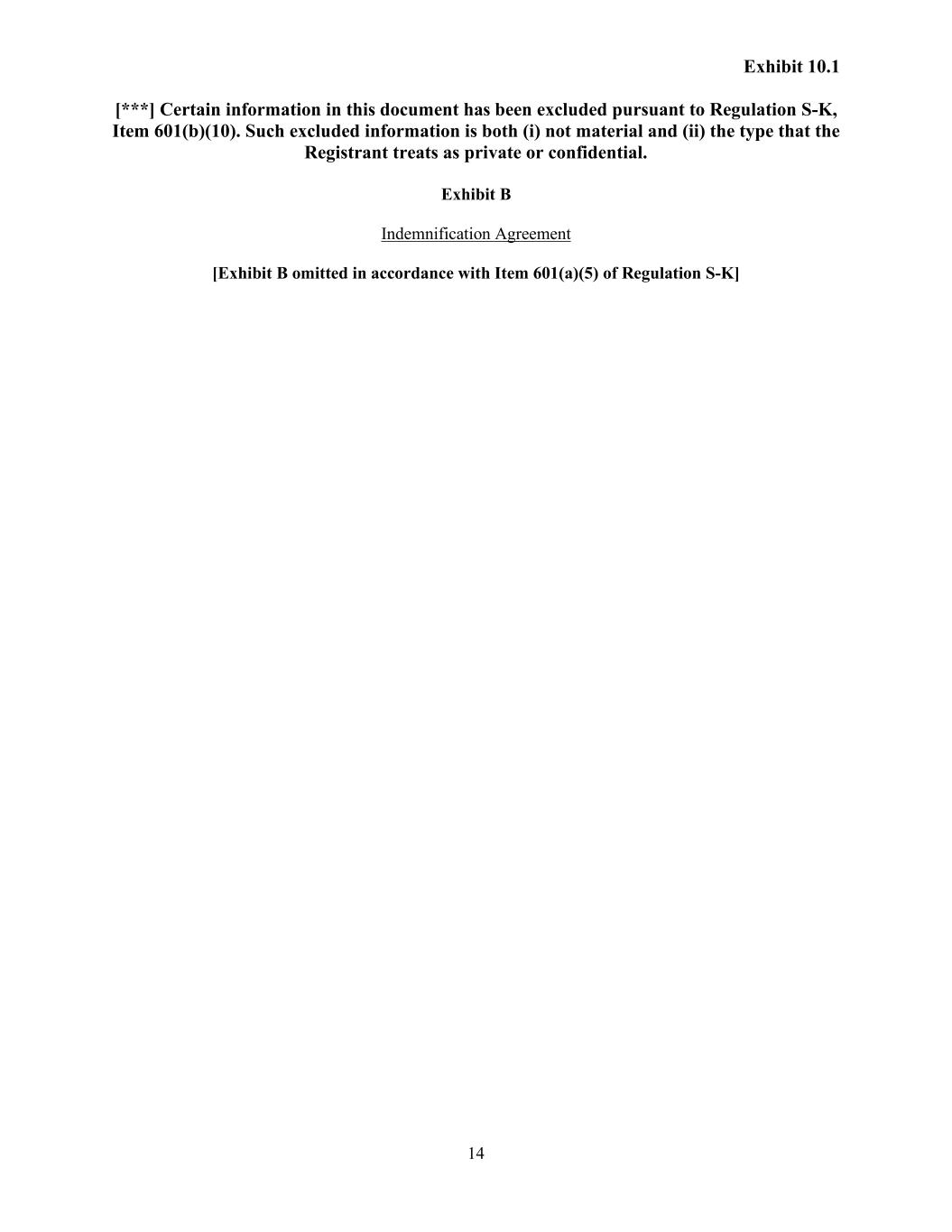 Exhibit 10.1 [***] Certain information in this document has been excluded pursuant to Regulation S-K, Item 601(b)(10). Such excluded information is both (i) not material and (ii) the type that the Registrant treats as private or confidential. 14 Exhibit B Indemnification Agreement [Exhibit B omitted in accordance with Item 601(a)(5) of Regulation S-K]