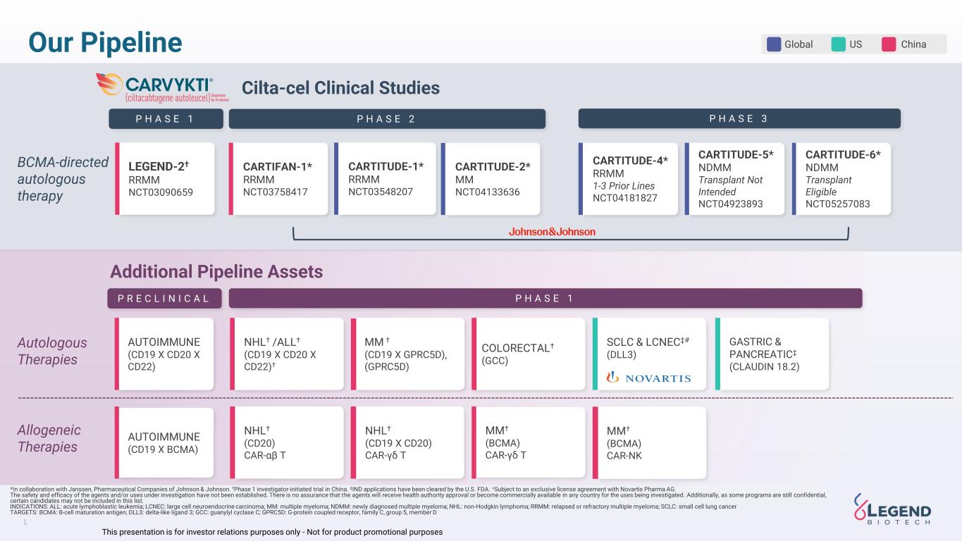 1 This presentation is for investor relations purposes only - Not for product promotional purposes Our Pipeline *In collaboration with Janssen, Pharmaceutical Companies of Johnson & Johnson. †Phase 1 investigator-initiated trial in China. ‡IND applications have been cleared by the U.S. FDA. #Subject to an exclusive license agreement with Novartis Pharma AG. The safety and efficacy of the agents and/or uses under investigation have not been established. There is no assurance that the agents will receive health authority approval or become commercially available in any country for the uses being investigated. Additionally, as some programs are still confidential, certain candidates may not be included in this list. INDICATIONS: ALL: acute lymphoblastic leukemia; LCNEC: large cell neuroendocrine carcinoma; MM: multiple myeloma; NDMM: newly diagnosed multiple myeloma; NHL: non-Hodgkin lymphoma; RRMM: relapsed or refractory multiple myeloma; SCLC: small cell lung cancer TARGETS: BCMA: B-cell maturation antigen; DLL3: delta-like ligand 3; GCC: guanylyl cyclase C; GPRC5D: G-protein coupled receptor, family C, group 5, member D Global US China Autologous Therapies BCMA-directed autologous therapy * P H A S E 2 P H A S E 3 LEGEND-2† RRMM NCT03090659 CARTIFAN-1* RRMM NCT03758417 CARTITUDE-1* RRMM NCT03548207 CARTITUDE-2* MM NCT04133636 CARTITUDE-4* RRMM 1-3 Prior Lines NCT04181827 CARTITUDE-5* NDMM Transplant Not Intended NCT04923893 CARTITUDE-6* NDMM Transplant Eligible NCT05257083 Cilta-cel Clinical Studies P H A S E 1 P R E C L I N I C A L P H A S E 1 NHL† /ALL† (CD19 X CD20 X CD22)† GASTRIC & PANCREATIC‡ (CLAUDIN 18.2) SCLC & LCNEC‡# (DLL3) COLORECTAL† (GCC) Additional Pipeline Assets Allogeneic Therapies MM† (BCMA) CAR-γδ T NHL† (CD19 X CD20) CAR-γδ T NHL† (CD20) CAR-αβ T MM† (BCMA) CAR-NK MM † (CD19 X GPRC5D), (GPRC5D) AUTOIMMUNE (CD19 X CD20 X CD22) AUTOIMMUNE (CD19 X BCMA)