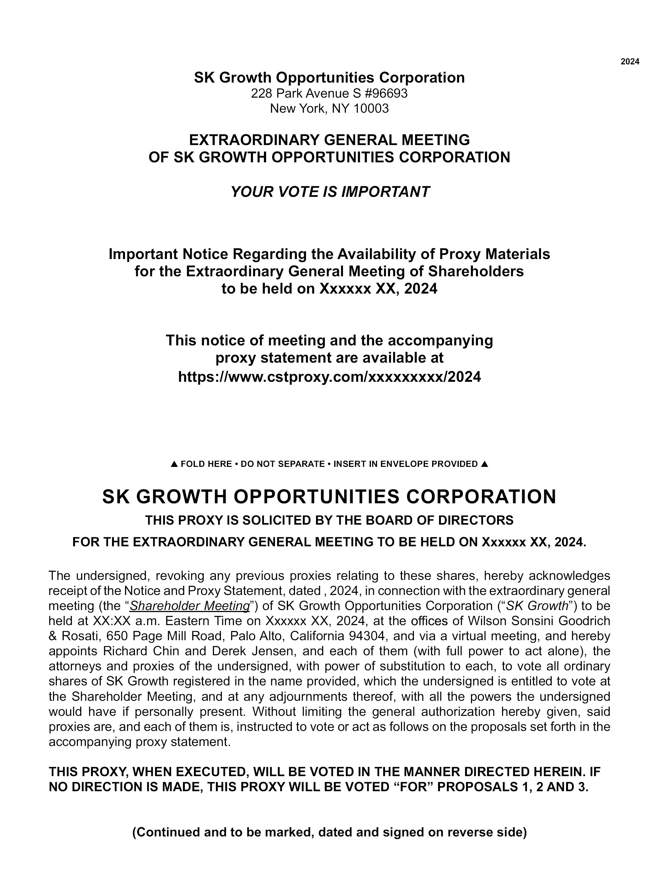 SK Growth Opportunities Corporation 228 Park Avenue S #96693 New York, NY 10003 EXTRAORDINARY GENERAL MEETING OF SK GROWTH OPPORTUNITIES CORPORATION YOUR VOTE IS IMPORTANT 2024 Important Notice Regarding the Availability of Proxy Materials for the Extraordinary General Meeting of Shareholders to be held on Xxxxxx XX, 2024 This notice of meeting and the accompanying proxy statement are available at https://www.cstproxy.com/xxxxxxxxx/2024 FOLD HERE • DO NOT SEPARATE • INSERT IN ENVELOPE PROVIDED SK GROWTH OPPORTUNITIES CORPORATION THIS PROXY IS SOLICITED BY THE BOARD OF DIRECTORS FOR THE EXTRAORDINARY GENERAL MEETING TO BE HELD ON Xxxxxx XX, 2024. The undersigned, revoking any previous proxies relating to these shares, hereby acknowledges receipt of the Notice and Proxy Statement, dated , 2024, in connection with the extraordinary general meeting (the “Shareholder Meeting”) of SK Growth Opportunities Corporation (“SK Growth”) to be held at XX:XX a.m. Eastern Time on Xxxxxx XX, 2024, at the offices of Wilson Sonsini Goodrich & Rosati, 650 Page Mill Road, Palo Alto, California 94304, and via a virtual meeting, and hereby appoints Richard Chin and Derek Jensen, and each of them (with full power to act alone), the attorneys and proxies of the undersigned, with power of substitution to each, to vote all ordinary shares of SK Growth registered in the name provided, which the undersigned is entitled to vote at the Shareholder Meeting, and at any adjournments thereof, with all the powers the undersigned would have if personally present. Without limiting the general authorization hereby given, said proxies are, and each of them is, instructed to vote or act as follows on the proposals set forth in the accompanying proxy statement. THIS PROXY, WHEN EXECUTED, WILL BE VOTED IN THE MANNER DIRECTED HEREIN. IF NO DIRECTION IS MADE, THIS PROXY WILL BE VOTED “FOR” PROPOSALS 1, 2 AND 3. (Continued and to be marked, dated and signed on reverse side)