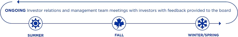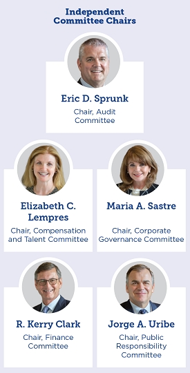 The board is also actively involved in overseeing the company’s strategies to recruit, develop and safeguard the well-being of our talented and dedicated team. The full board regularly discusses matters of corporate culture and employee engagement to ensure that our teams embody the attributes, behaviors and commitment necessary to advance our strategies. An essential part of our culture is our commitment to operating with integrity and acting with the highest ethical standards. This starts with the clear expectation set by the board and is reinforced by the audit committee and board’s regular reviews of our ethics and compliance reports.