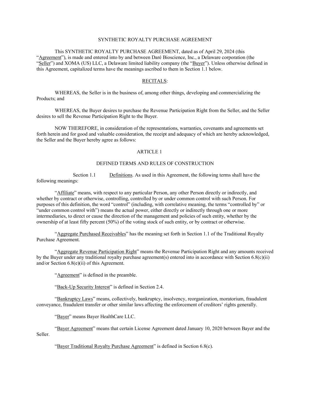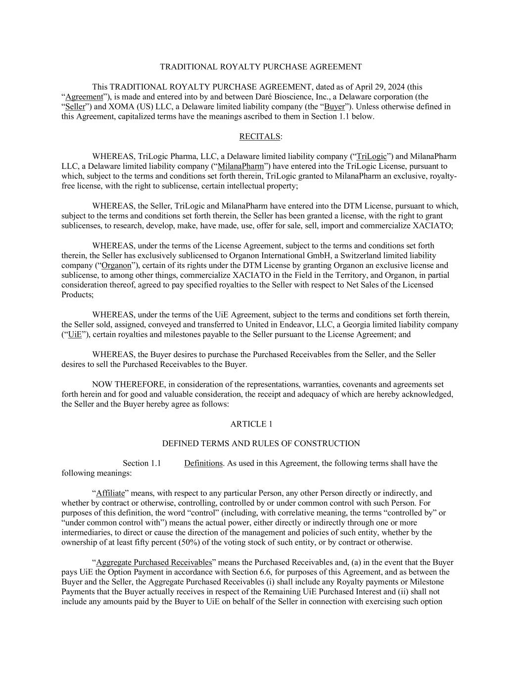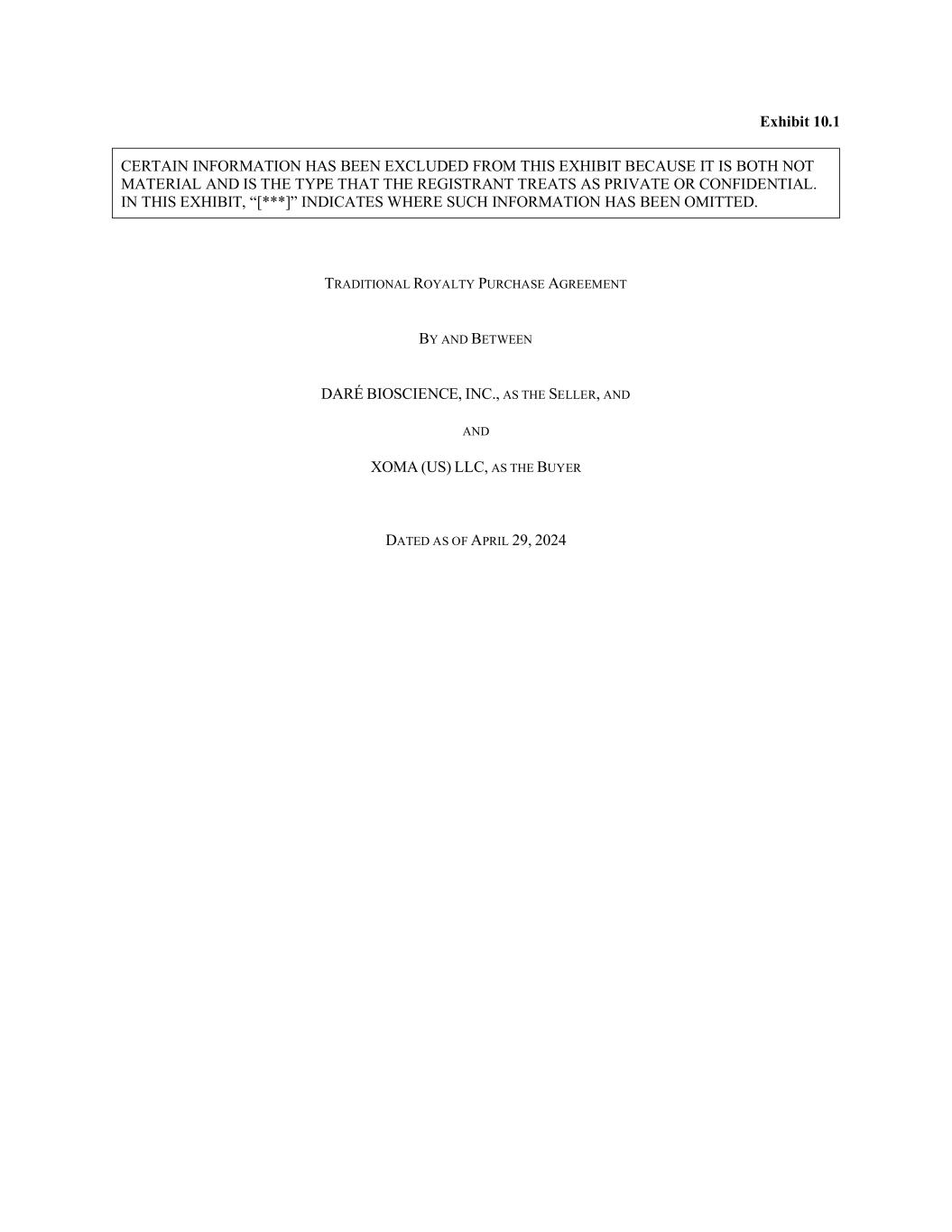 dare-20240630FALSE2024Q20001401914--12-31Dare Bioscience, Inc.http://fasb.org/us-gaap/2024#LicenseMemberhttp://fasb.org/us-gaap/2024#LicenseMemberhttp://fasb.org/us-gaap/2024#LicenseMemberhttp://fasb.org/us-gaap/2024#RoyaltyMember0.08330.0833xbrli:sharesiso4217:USDiso4217:USDxbrli:sharesdare:segmentxbrli:puredare:expertdare:obligationutr:Yutr:sqftdare:payment00014019142024-01-012024-06-3000014019142024-08-0900014019142024-06-3000014019142023-12-3100014019142023-04-012023-06-3000014019142023-01-012023-06-3000014019142024-04-012024-06-300001401914us-gaap:CommonStockMember2023-12-310001401914us-gaap:AccumulatedOtherComprehensiveIncomeMember2023-12-310001401914us-gaap:AdditionalPaidInCapitalMember2023-12-310001401914us-gaap:RetainedEarningsMember2023-12-310001401914us-gaap:AdditionalPaidInCapitalMember2024-01-012024-03-3100014019142024-01-012024-03-310001401914us-gaap:CommonStockMember2024-01-012024-03-310001401914us-gaap:RetainedEarningsMember2024-01-012024-03-310001401914us-gaap:AccumulatedOtherComprehensiveIncomeMember2024-01-012024-03-310001401914us-gaap:CommonStockMember2024-03-310001401914us-gaap:AccumulatedOtherComprehensiveIncomeMember2024-03-310001401914us-gaap:AdditionalPaidInCapitalMember2024-03-310001401914us-gaap:RetainedEarningsMember2024-03-3100014019142024-03-310001401914us-gaap:AdditionalPaidInCapitalMember2024-04-012024-06-300001401914us-gaap:CommonStockMember2024-04-012024-06-300001401914us-gaap:RetainedEarningsMember2024-04-012024-06-300001401914us-gaap:AccumulatedOtherComprehensiveIncomeMember2024-04-012024-06-300001401914us-gaap:CommonStockMember2024-06-300001401914us-gaap:AccumulatedOtherComprehensiveIncomeMember2024-06-300001401914us-gaap:AdditionalPaidInCapitalMember2024-06-300001401914us-gaap:RetainedEarningsMember2024-06-300001401914us-gaap:CommonStockMember2022-12-310001401914us-gaap:AccumulatedOtherComprehensiveIncomeMember2022-12-310001401914us-gaap:AdditionalPaidInCapitalMember2022-12-310001401914us-gaap:RetainedEarningsMember2022-12-3100014019142022-12-310001401914us-gaap:AdditionalPaidInCapitalMember2023-01-012023-03-3100014019142023-01-012023-03-310001401914us-gaap:CommonStockMember2023-01-012023-03-310001401914us-gaap:RetainedEarningsMember2023-01-012023-03-310001401914us-gaap:AccumulatedOtherComprehensiveIncomeMember2023-01-012023-03-310001401914us-gaap:CommonStockMember2023-03-310001401914us-gaap:AccumulatedOtherComprehensiveIncomeMember2023-03-310001401914us-gaap:AdditionalPaidInCapitalMember2023-03-310001401914us-gaap:RetainedEarningsMember2023-03-3100014019142023-03-310001401914us-gaap:AdditionalPaidInCapitalMember2023-04-012023-06-300001401914us-gaap:CommonStockMember2023-04-012023-06-300001401914us-gaap:RetainedEarningsMember2023-04-012023-06-300001401914us-gaap:AccumulatedOtherComprehensiveIncomeMember2023-04-012023-06-300001401914us-gaap:CommonStockMember2023-06-300001401914us-gaap:AccumulatedOtherComprehensiveIncomeMember2023-06-300001401914us-gaap:AdditionalPaidInCapitalMember2023-06-300001401914us-gaap:RetainedEarningsMember2023-06-3000014019142023-06-300001401914us-gaap:SubsequentEventMember2024-07-012024-07-010001401914dare:XOMAUSLLCMemberdare:RoyaltyPurchaseAgreementMember2024-04-290001401914dare:XOMAUSLLCMemberdare:RoyaltyPurchaseAgreementMember2024-04-292024-04-290001401914us-gaap:FairValueInputsLevel1Memberus-gaap:FairValueMeasurementsRecurringMember2024-06-300001401914us-gaap:FairValueInputsLevel2Memberus-gaap:FairValueMeasurementsRecurringMember2024-06-300001401914us-gaap:FairValueInputsLevel3Memberus-gaap:FairValueMeasurementsRecurringMember2024-06-300001401914us-gaap:FairValueMeasurementsRecurringMember2024-06-300001401914us-gaap:FairValueInputsLevel1Memberus-gaap:FairValueMeasurementsRecurringMember2023-12-310001401914us-gaap:FairValueInputsLevel2Memberus-gaap:FairValueMeasurementsRecurringMember2023-12-310001401914us-gaap:FairValueInputsLevel3Memberus-gaap:FairValueMeasurementsRecurringMember2023-12-310001401914us-gaap:FairValueMeasurementsRecurringMember2023-12-310001401914dare:OrganonMember2022-07-012022-07-310001401914dare:OrganonMember2023-07-012023-07-310001401914dare:OrganonMember2024-04-012024-06-300001401914dare:OrganonMember2024-06-300001401914dare:LicenseAndCollaborationRevenueMember2024-01-012024-06-300001401914dare:OrganonMember2024-01-012024-06-300001401914dare:BayerHealthcareLicenseAgreementMember2024-01-012024-06-300001401914dare:BayerHealthcareLicenseAgreementMember2024-04-012024-06-300001401914dare:BayerHealthcareLicenseAgreementMember2020-01-310001401914dare:BayerHealthcareLicenseAgreementMember2020-01-012020-01-310001401914srt:MinimumMemberdare:BayerHealthcareLicenseAgreementMember2022-01-012022-06-300001401914dare:UponAchievingCertainDevelopmentMilestonesMemberdare:DouglasLicenseAgreementMember2023-08-310001401914dare:UponAchievingCertainCommercialMilestonesMemberdare:DouglasLicenseAgreementMember2023-08-310001401914dare:ClinicalAndRegulatoryMilestonesMemberdare:HennepinLicenseAgreementMember2022-08-012022-08-310001401914dare:SalesMilestonesMemberdare:HennepinLicenseAgreementMember2022-08-012022-08-310001401914dare:MicrochipsBiotechInc.Memberdare:UponAchievementOfSpecifiedDevelopmentAndRegulatoryMilestonesMember2019-11-012019-11-300001401914dare:MicrochipsBiotechInc.Memberdare:UponAchievementOfSpecifiedDevelopmentAndRegulatoryMilestonesMember2019-11-300001401914dare:MicrochipsBiotechInc.Member2021-06-012021-06-300001401914dare:MicrochipsBiotechInc.Memberdare:FormerStockholdersOfMBIMember2021-09-012021-09-300001401914us-gaap:RelatedPartyMembersrt:MaximumMemberdare:UponAchievingCertainDevelopmentMilestonesMemberus-gaap:LicensingAgreementsMember2021-01-012021-12-310001401914us-gaap:RelatedPartyMembersrt:MaximumMemberdare:UponAchievingCertainDevelopmentMilestonesMemberus-gaap:LicensingAgreementsMember2023-10-012023-12-310001401914us-gaap:RelatedPartyMemberdare:LicensedProductOrProcessForVaginalOrUrologicalUseMemberus-gaap:LicensingAgreementsMember2024-01-012024-06-300001401914dare:UponAchievementOfSpecifiedDevelopment
