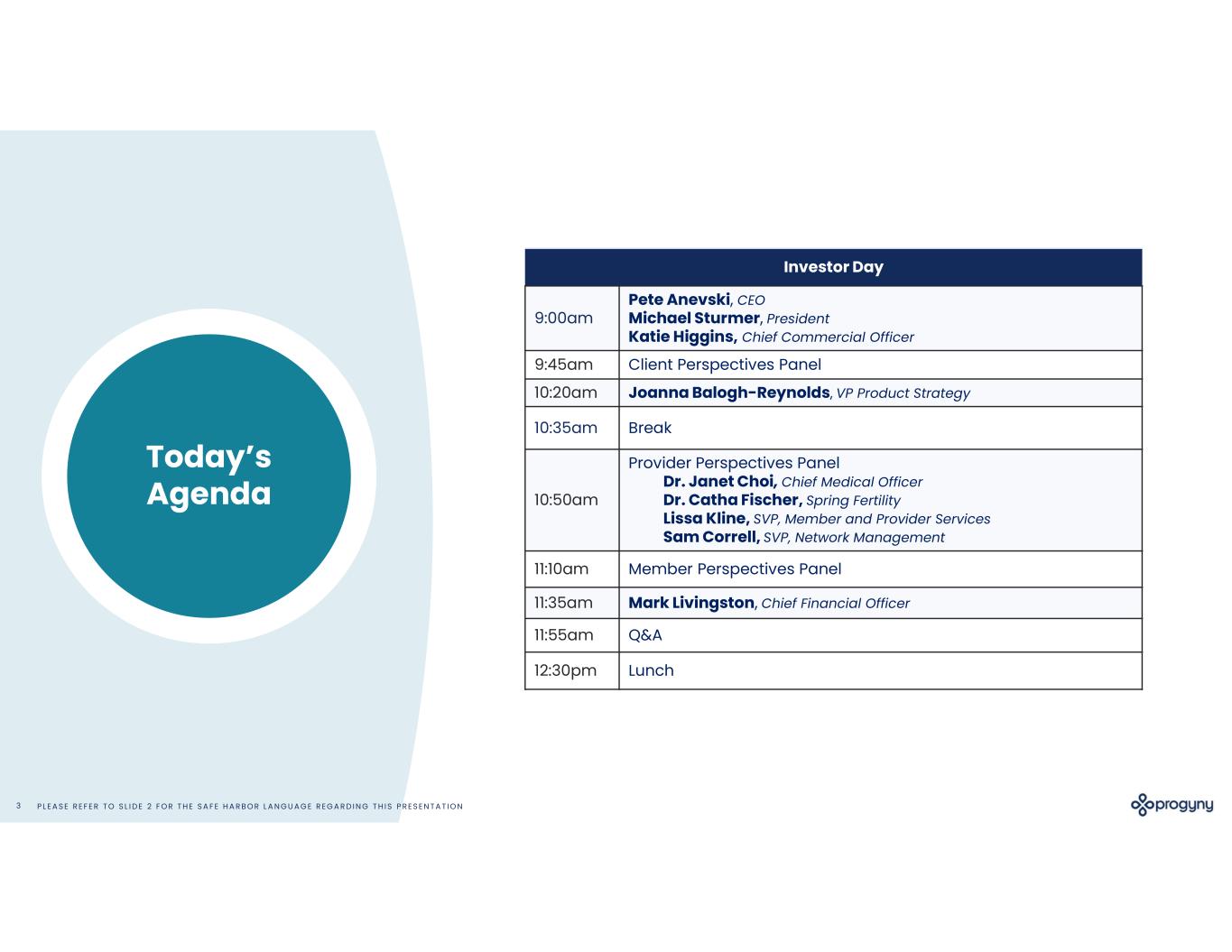 altern Today’s Agenda Investor Day Pete Anevski, CEO Michael Sturmer, President Katie Higgins, Chief Commercial Officer 9:00am Client Perspectives Panel9:45am Joanna Balogh-Reynolds, VP Product Strategy10:20am Break10:35am Provider Perspectives Panel Dr. Janet Choi, Chief Medical Officer Dr. Catha Fischer, Spring Fertility Lissa Kline, SVP, Member and Provider Services Sam Correll, SVP, Network Management 10:50am Member Perspectives Panel11:10am Mark Livingston, Chief Financial Officer11:35am Q&A11:55am Lunch12:30pm P L E A S E R E F E R T O S L I D E 2 F O R T H E S A F E H A R B O R L A N G U A G E R E G A R D I N G T H I S P R E S E N T A T I O N3