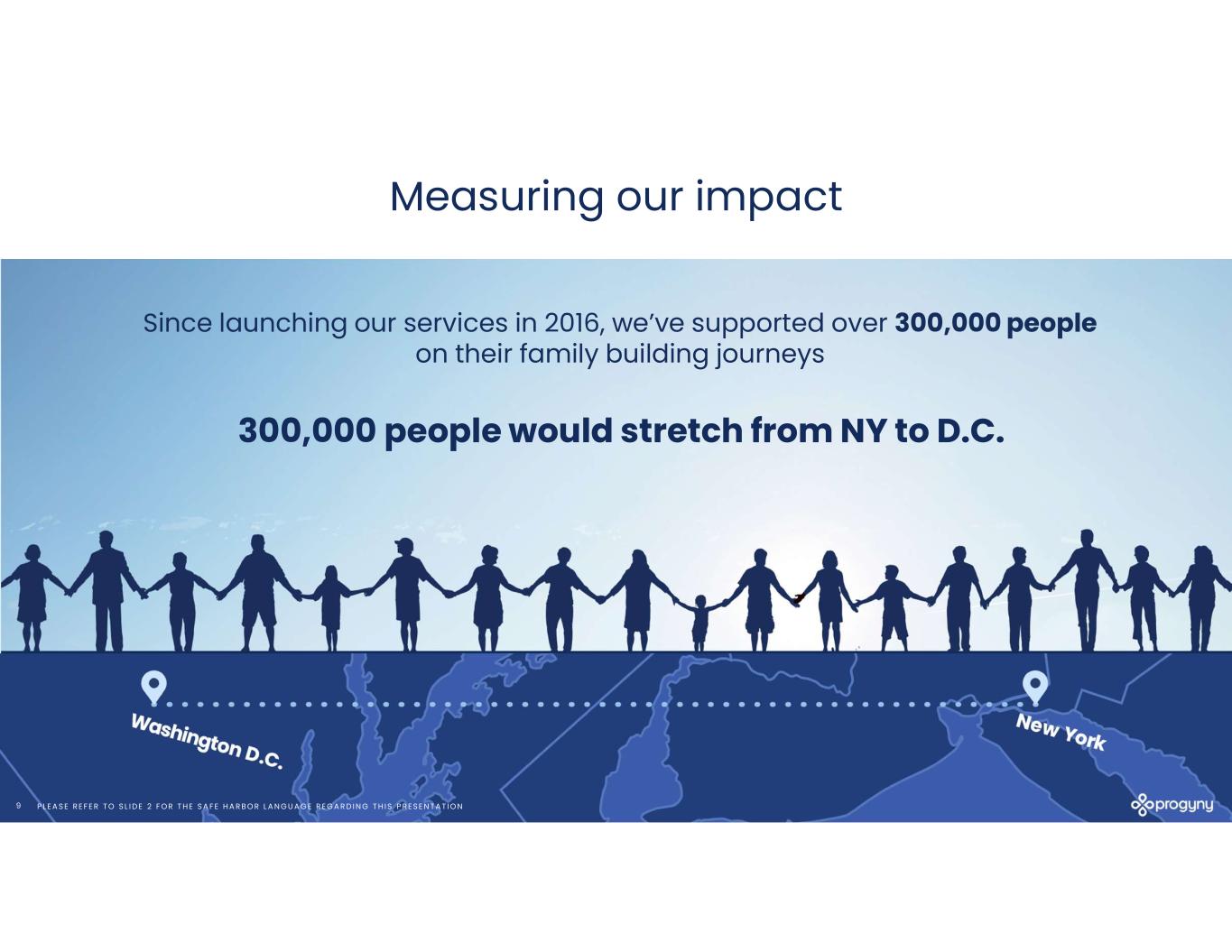 P L E A S E R E F E R T O S L I D E 2 F O R T H E S A F E H A R B O R L A N G U A G E R E G A R D I N G T H I S P R E S E N T A T I O N9 Measuring our impact Since launching our services in 2016, we’ve supported over 300,000 people on their family building journeys 300,000 people would stretch from NY to D.C.